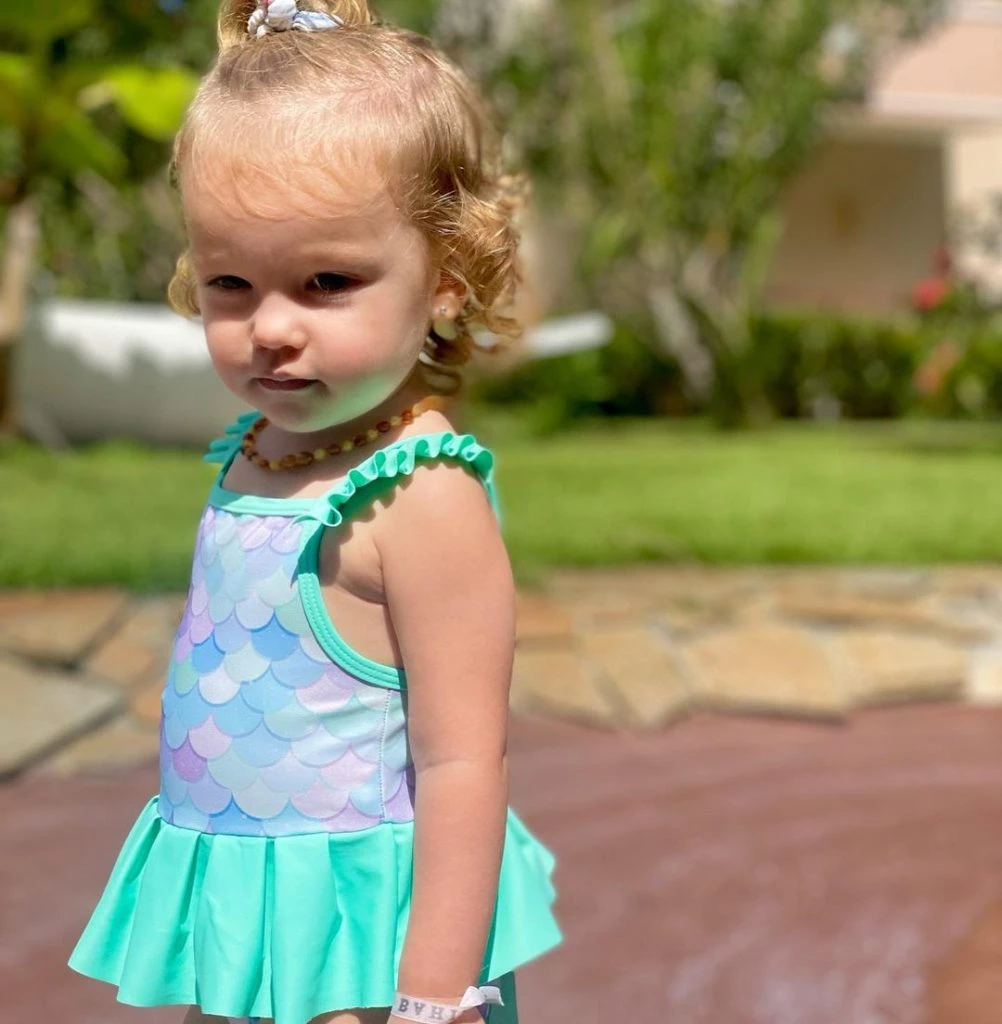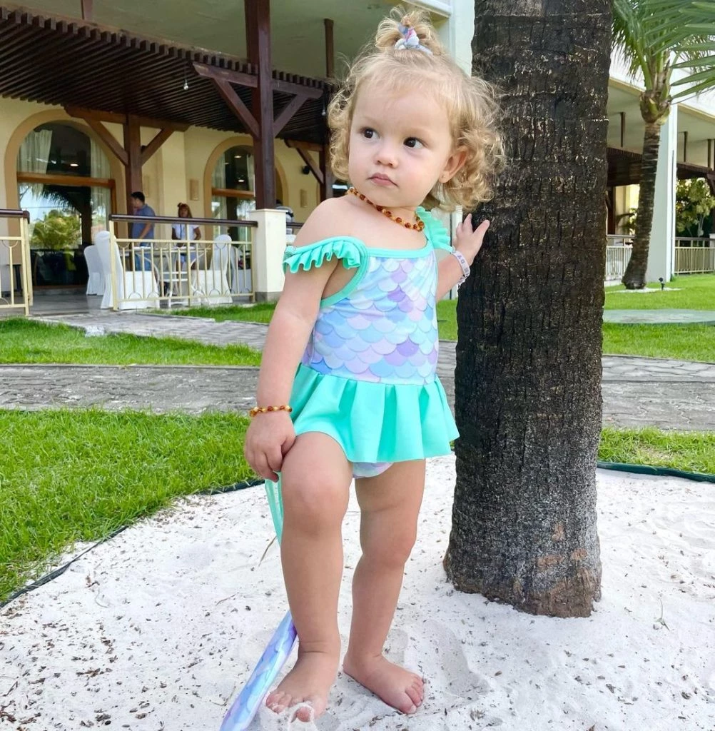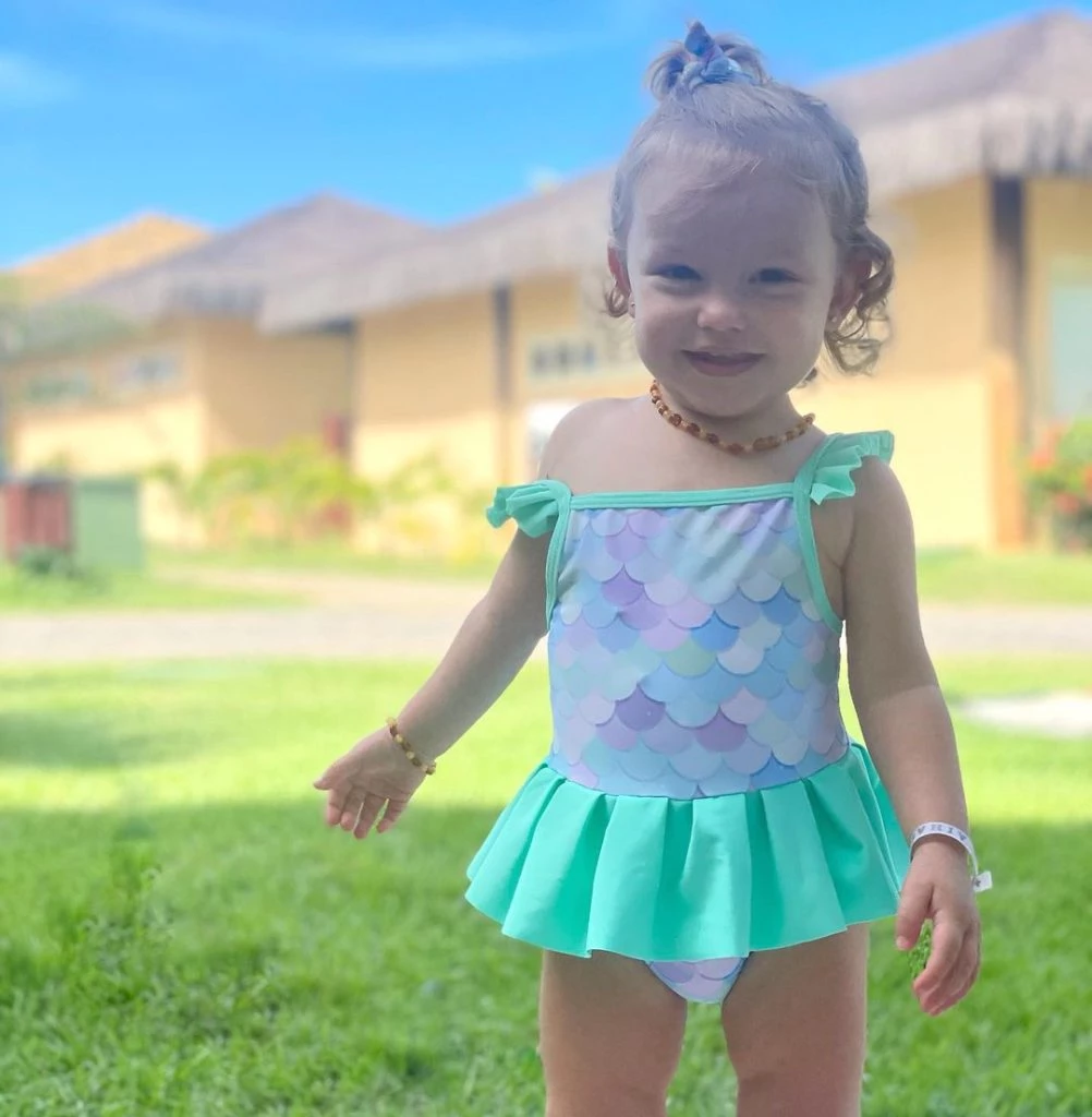 En las fotografías, la pequeña aparece luciendo su look de playa: una malla enteriza con una falda y estampa de escamas. Además, este exclusivo diseño lleva una cola de sirena, que le da el toque a este traje de baño infantil. Se trata de un detalle desmontable, que permite sacarlo para dejar ver sólo la pollera.