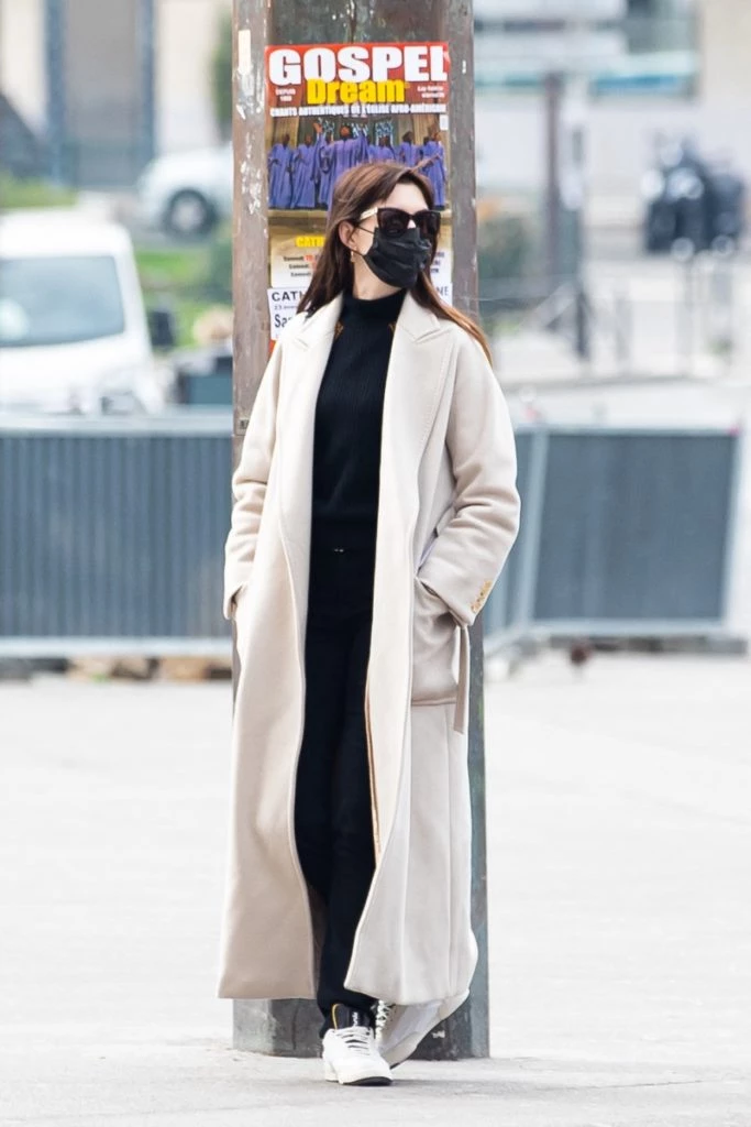 Anne Hathaway elige un tapado blanco para complementar su looks athleisure