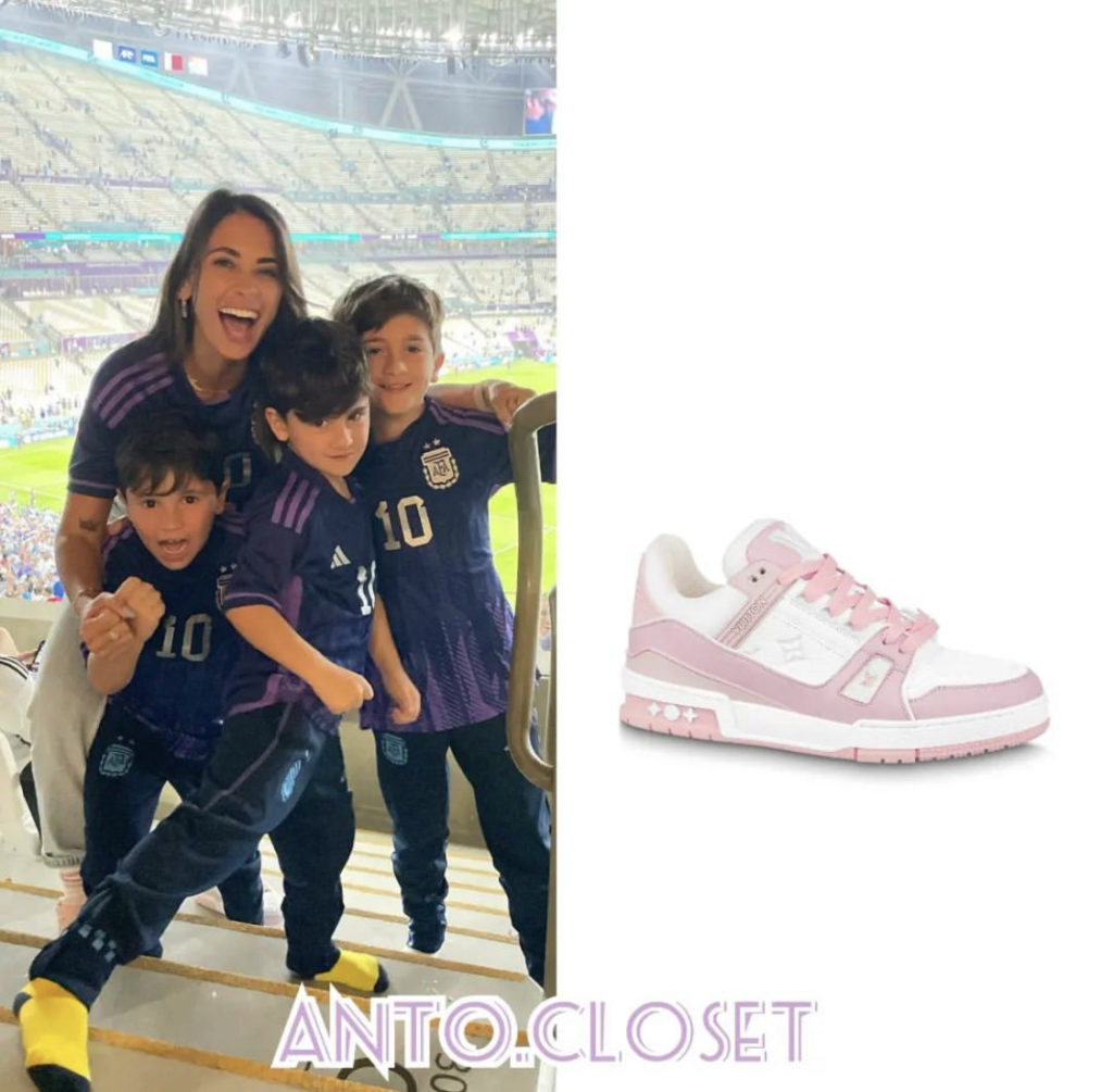 Antonela Roccuzzo tiene hoy millones de seguidores en Instagram que la siguen no solo por ser la pareja del futbolista, sino también por su impecable estilo. Y para el partido de semifinales frente a Croacia, eligió un atuendo clásico que combinó con un calzado muy trendy: un par de zapatillas Louis Vuitton blancas y rosas.