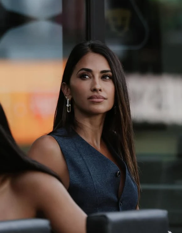 Antonela lo combinó con sandalias negras abiertas, un minibolso trenzado y el pelosuelto, logrando un equilibrio entre lo descontracturado y lo sofisticado. El chaleco, usado sin nada debajo, suma un toque actual y minimalista que estiliza la figura.