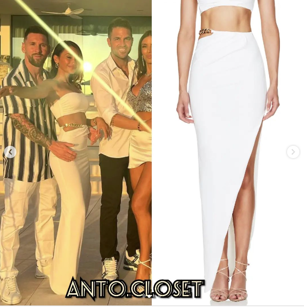 El look de la esposa de Lionel estaba integrado por dos piezas: una pollera lapiz con detalle de cadena sobre su cintura y crop top con escote irregular con un solo hombro, que repetía detalle de cadena en bretel.