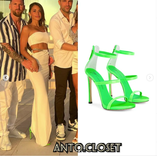 Antonela le sumó color a su look con sus sandalias verdes de Giuseppe Zanotti. Y completó usando un peinado semi recogido en un lado.
