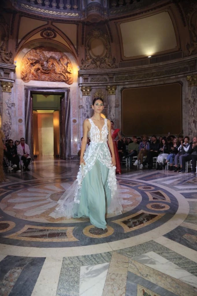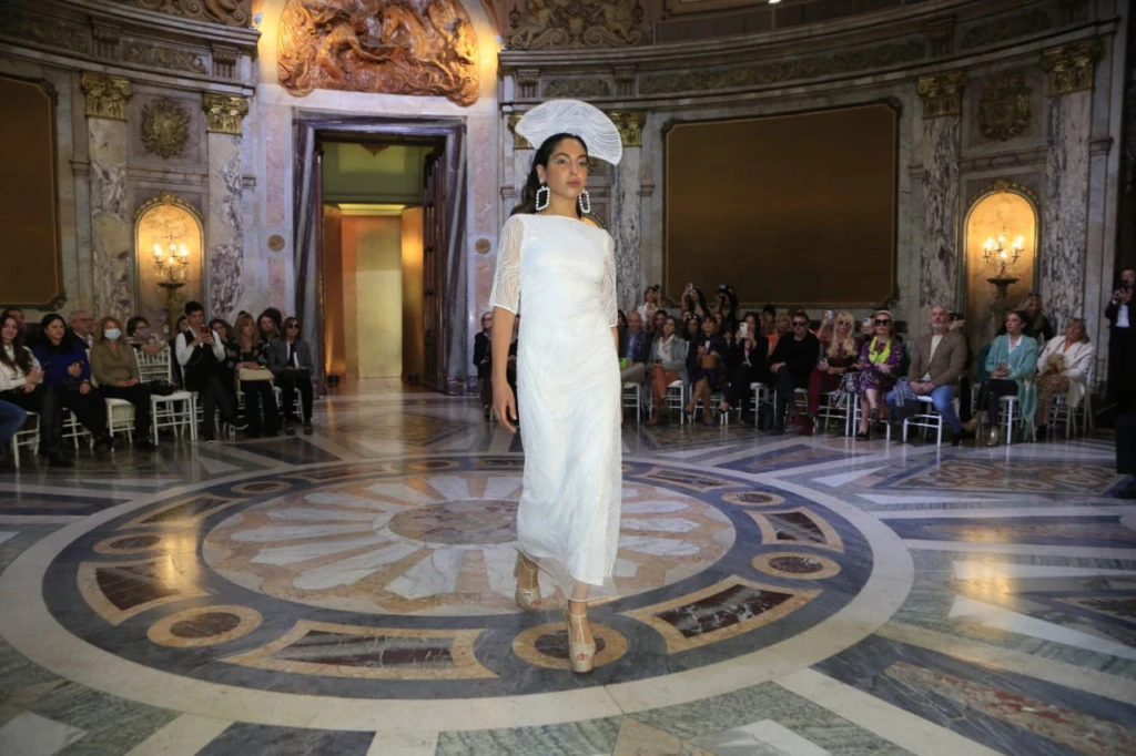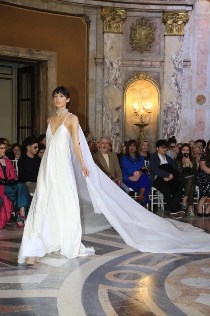 Ana Terrasanta presentó la colección “Methanoia”, inspirada en la Virgen de San Nicolás. Con el abrazo de María hacia nosotros una cosa que pide es la conversión, un cambio rotundo de vida, es decir, un cambio de lo oscuro a lo claro, cambios de colores, cambios de volúmenes.
