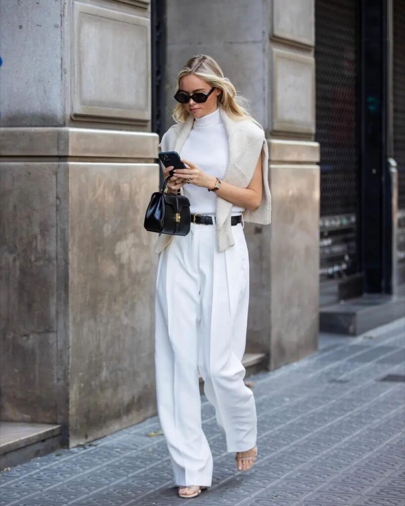 Si tu rutina incluye ir a la oficina o reuniones en las que necesitas un look más formal y de estilo empresarial, optá por un blazer o un suéter de hilo para llevar sobre los hombros.