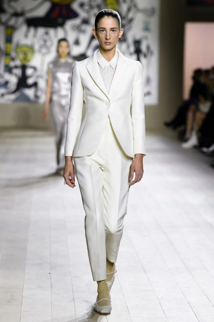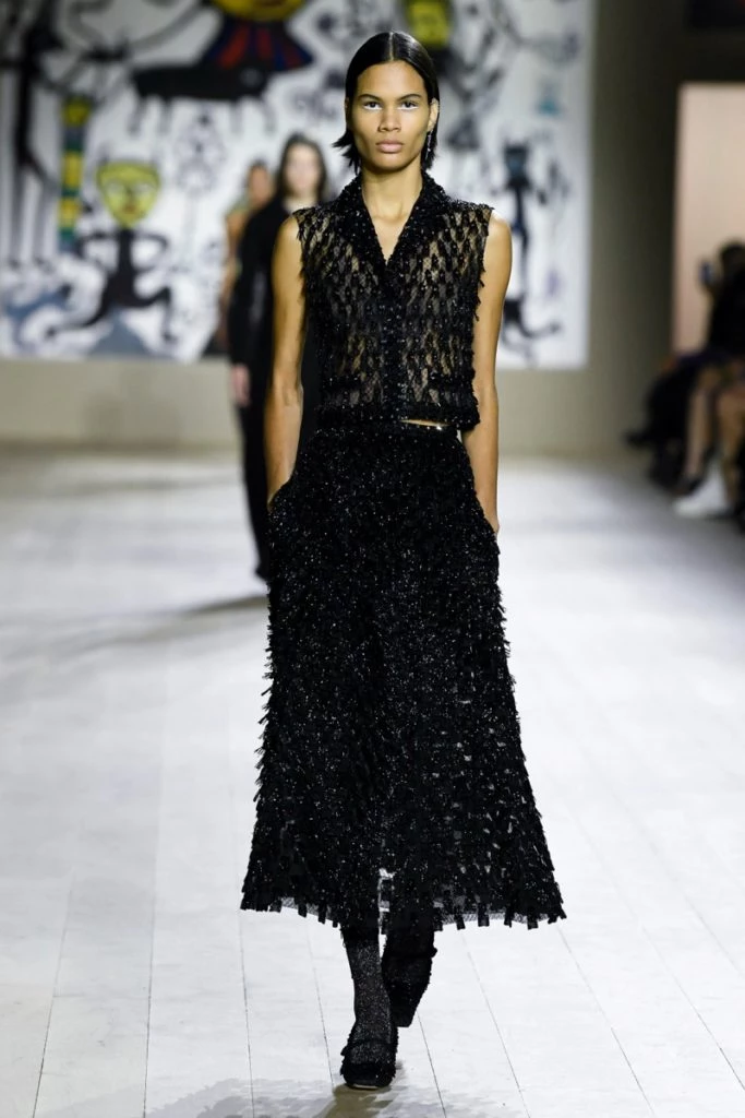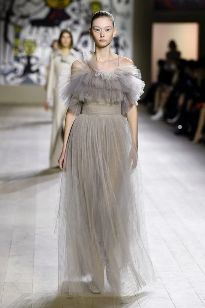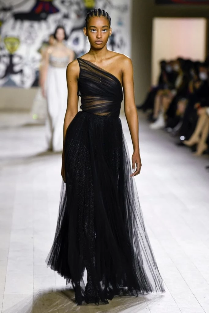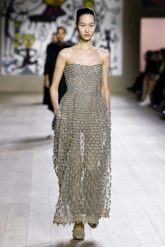 La colección de alta costura primavera/verano 2022 de Dior incide en la magia de los bordados y su efecto tridimensional en el cuerpo humano y en el poder de las medias, uno de los emblemas de la colección, para vestir a una mujer.