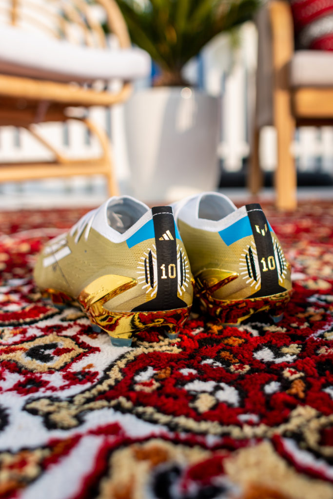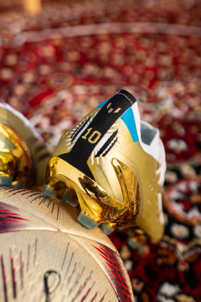 Estamos hablando del kit Adidas, que incluye también camiseta (la tradicional celeste y blanca) y pelota con estampado de Match Day (también dorada, con el logo del Mundial y algunos detalles en rojo). Son diseños exclusivos que el jugador llevará este domingo donde Argentina irá por la final del mundo.
