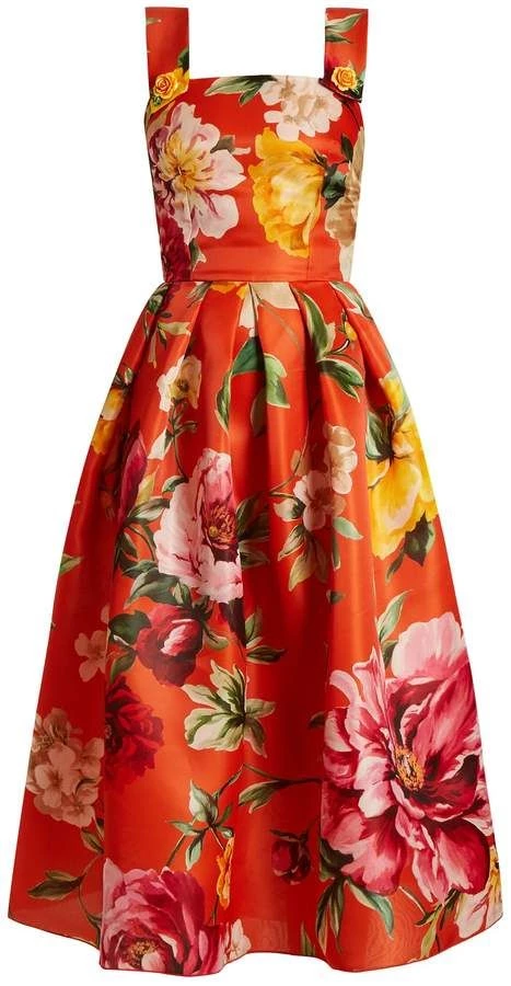 La reina lució un vestido de seda de Dolce & Gabbana, el cual está estampado con exuberantes rosas que "podrían sacarse de un hermoso cuadro de naturaleza muerta, y se vuelven aún más llamativos con el fondo naranja intenso", según revela la firma en su página web.