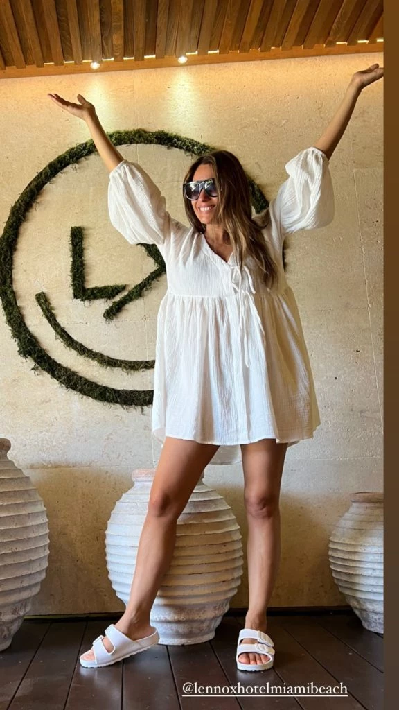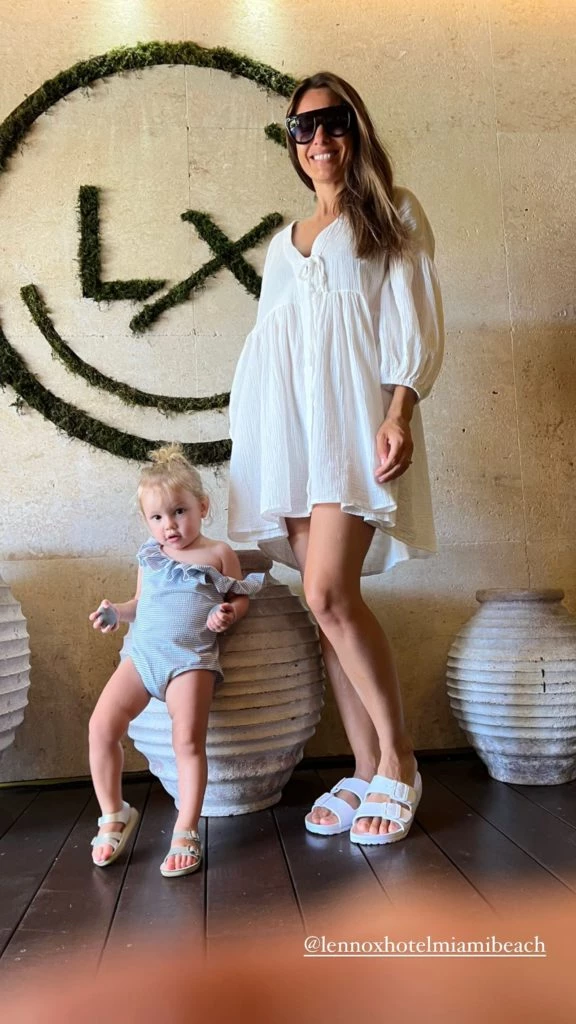 En las últimas horas, la madre de Anita Moritán también sorprendió con un outfit off white, es decir, donde predomina el color blanco en absoluto. La modelo llevó un vestido de lino holgado, con mangas 3/4, tipo princesa y con largo por encima de las rodillas. En este caso, lució unas sandalias blancas similares a las de su hija, que usó un enterito celeste con volados.