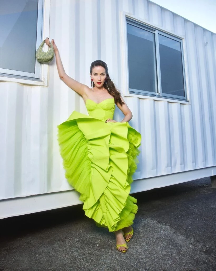 Por otro lado, Oreiro lo combinó con un bolso de hombro, con detalles de cristal, también en color verde neón, y unos zapatos stiletto haciendo juego. A su vez, llevó como accesorios unos aros colgantes con pedrería roja y blancas brillantes. En cuanto a su manicuría, la actriz llevó un tono negro destacando del resto del look.