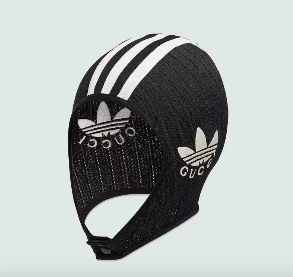Pero eso no fue todo, ya que sumó un gorro de punto estilo natación- en color negro-que forma parte de la colección Adidas x Gucci y lleva el bordado de trébol Gucci. De esta manera, el monograma GG se combina con los símbolos de Adidas, creando algo original y diferente.