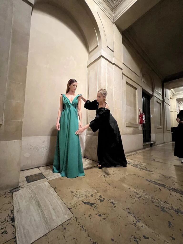 " Delfina usó un vestido asimétrico largo en crêpe color verde, modelado sobre su cuerpo mediante pliegues asimétricos. El diseñó tenía espalda con escote profundo y asimétrico de la que surge una cola" nos cuenta la creadora Min Agostini. Chaves llevó el pelo suelto con raya al costado y apostó por un maquillaje con sombras metalizadas.
