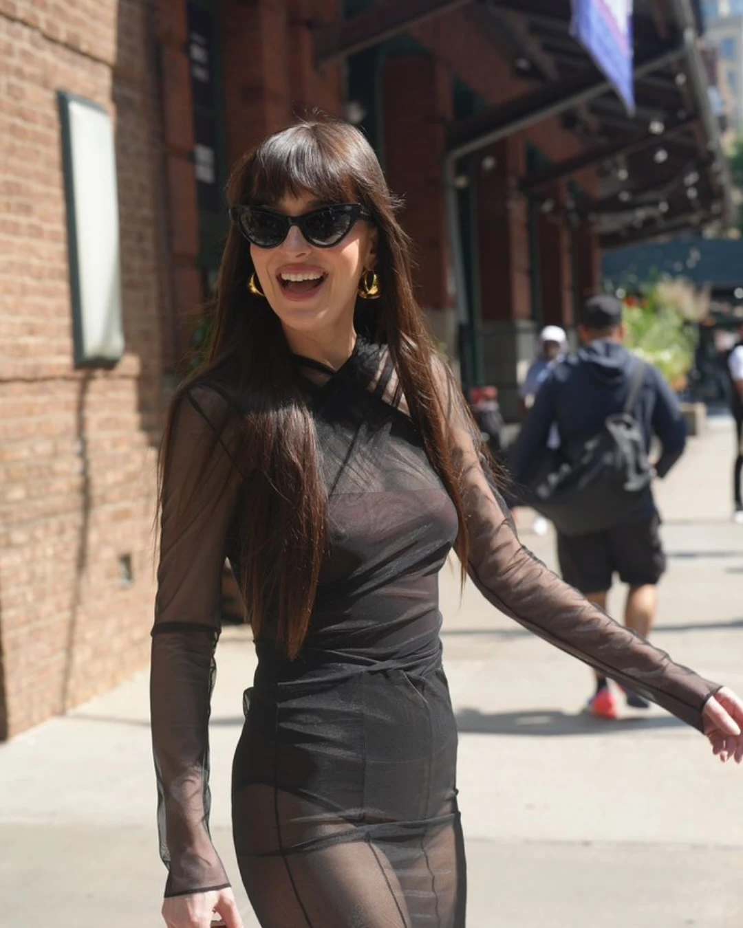 Lo combinó con un bolso de mano marrón Jackie 1961 de Gucci, gafas negras Oliver Peoples x Khaite y stilettos negros YSL. Además, optó por joyas minimalistas como unos aros dorados de Kate Young x Monica Vinader y anillos de Cece Jewellery. En cuanto a su beauty look, la actriz llevó flequillo ondulado y el cabello suelto, al natural.