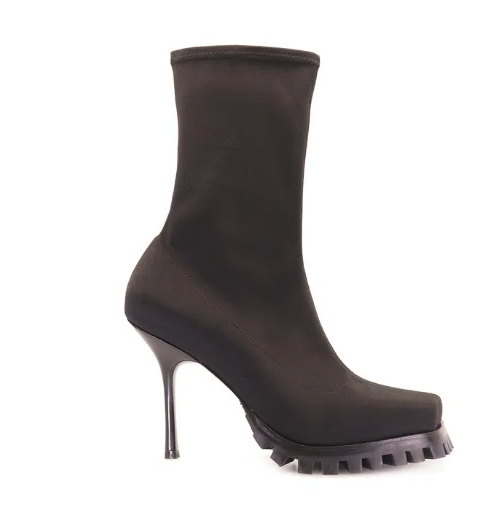 Bota en lycra con suelin de goma tipo tractor. Taco pintado en negro. Altura de caña de 21 cm. Altura de plataforma de 1,5 cm. Altura de taco de 8 cm. Cuestan $ 24.500.