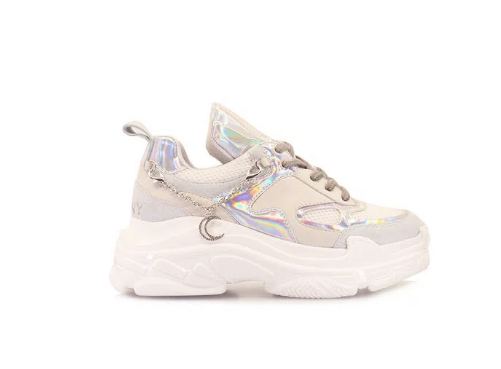 Zapatilla combinada en mesh deportivo, nobuk y tornasol plata. Aplqiue desmontable de cadena con dije de luna con strass. Dome de goma con Luna y Rayo en lengua. Aplqiue de marca con glitter en talón. Base deportiva inyectada en blanco. Altura de taco de 5 cm. Altura de plataforma de 3 cm. Zapatilla de horma chica. Cuestan $ 21.000.