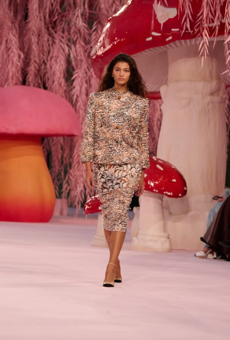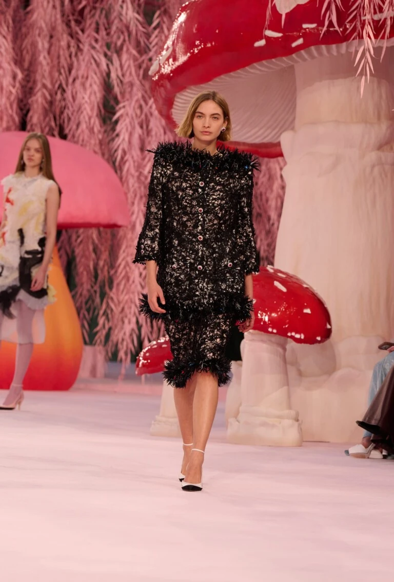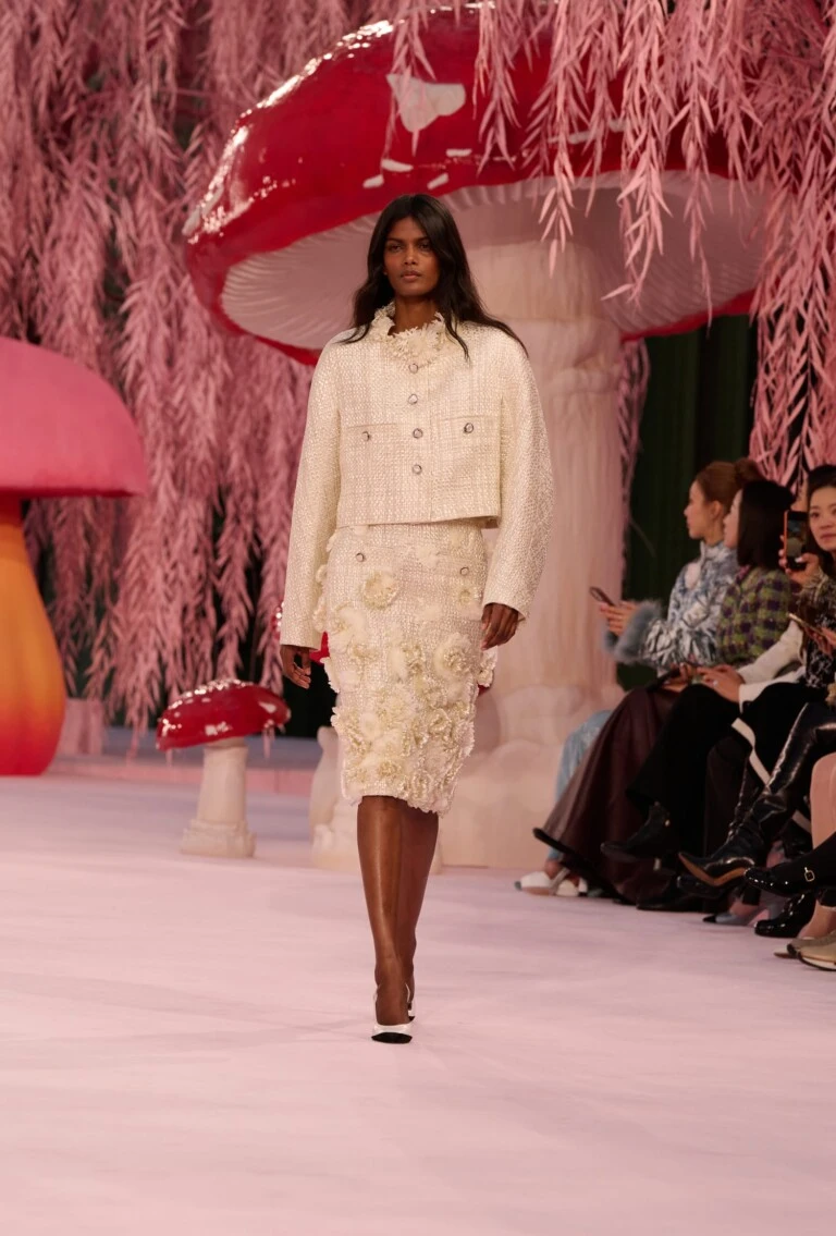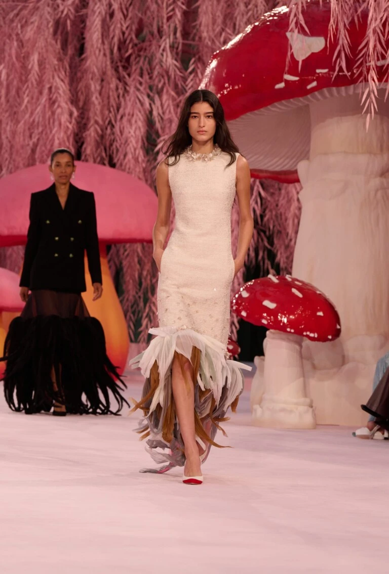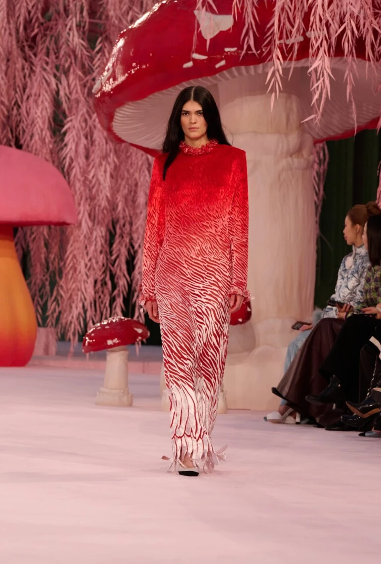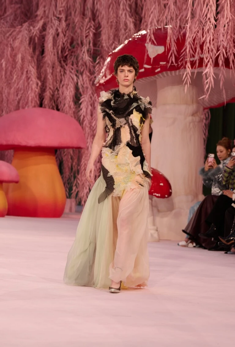 La puesta en escena reforzó la narrativa onírica del desfile. El Grand Palais se transformó en un bosque encantado, poblado por enormes setas que remitían al universo de Alicia en el País de las Maravillas. La paleta cromática, dominada por rosas suaves y tonos luminosos, aportó una sensación de alegría y optimismo que contrastó con el clima gris de París.