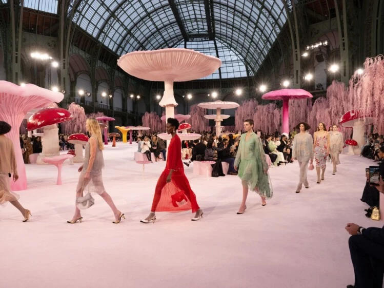 La puesta en escena reforzó la narrativa onírica del desfile. El Grand Palais se transformó en un bosque encantado, poblado por enormes setas que remitían al universo de Alicia en el País de las Maravillas. La paleta cromática, dominada por rosas suaves y tonos luminosos, aportó una sensación de alegría y optimismo que contrastó con el clima gris de París.