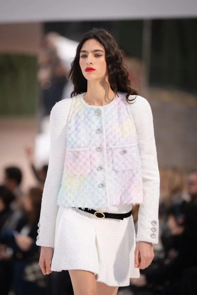 A través de la ligereza de los materiales y el sutil trampantojo, el encaje pintado y la gasa bordada realzada con halos de color crean la ilusión perfecta del tweed. Una imaginación onírica y teatral llevada a la vida por la Alta Costura.