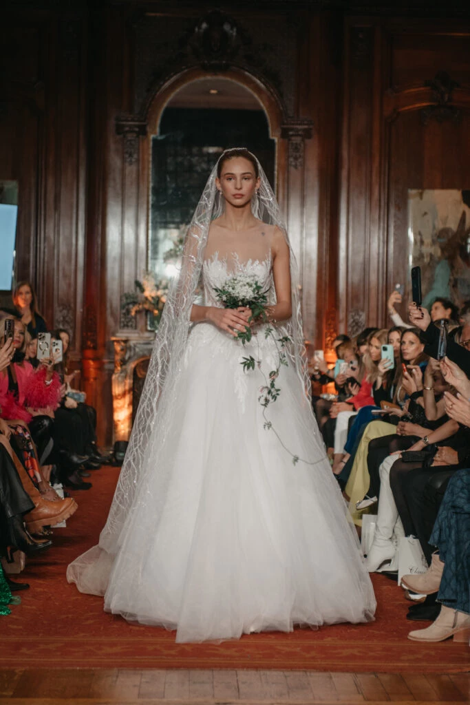 Esta exclusiva colección presenta una fusión elegante de encajes, gasas de pura seda natural, micados, organzas y tules trabajados. En la que cada detalle está meticulosamente bordado a mano, creando una sinfonía visual de texturas y belleza.