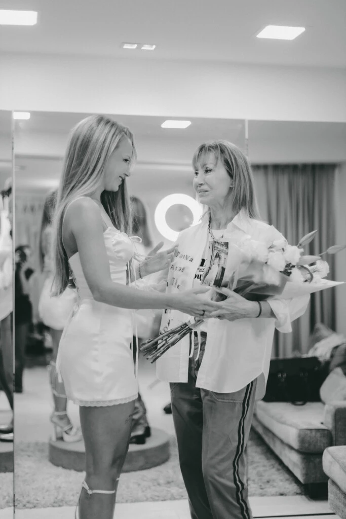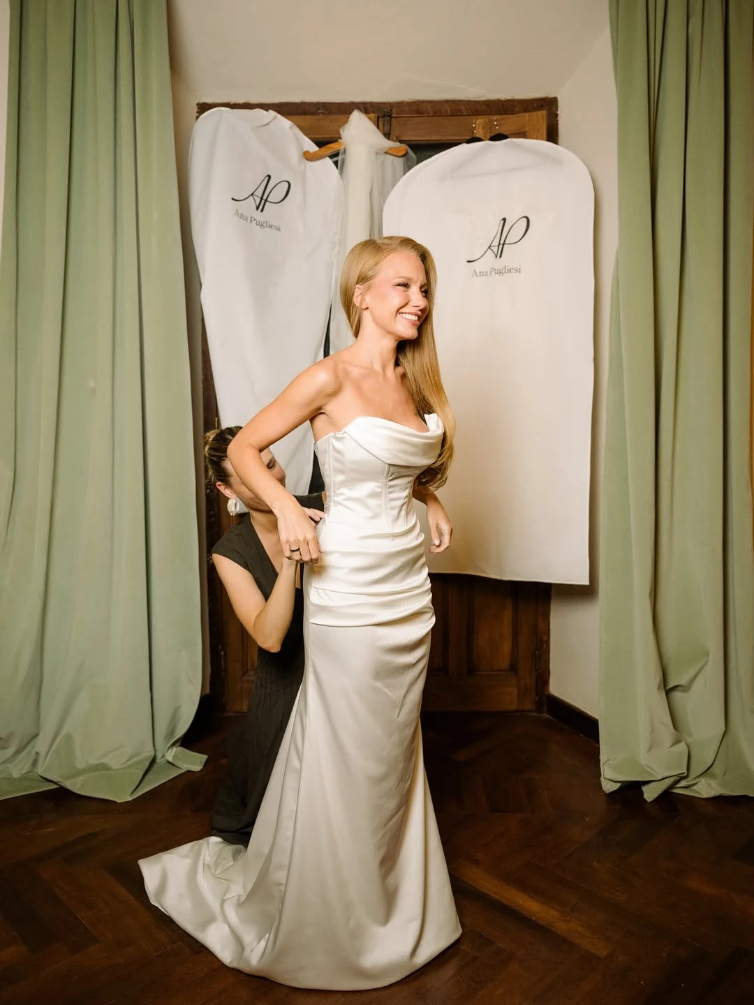 El primer vestido fue confeccionado íntegramente en piel de ángel de seda natural, un textil noble que aporta un brillo sutil, una caída impecable y una sensación etérea sobre la piel. Su tono off-white realzó la pureza del diseño y aportó una elegancia atemporal, en palabras de Pugliesi, creadora de esta pieza exclusiva.