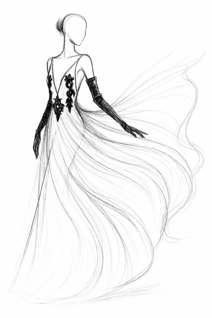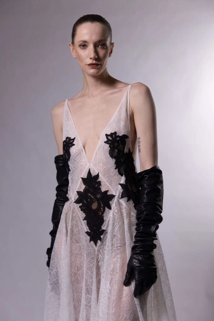 La silueta, de caída libre y corte evasé, parte de un profundo escote en V y se abre hasta una espalda pronunciada que revela la arquitectura del cuerpo. Cortes angulares y picos estratégicos definen un lenguaje de precisión y movimiento, reforzado por los guantes largos de cuero negro, que suman dramatismo y un guiño de rebeldía.