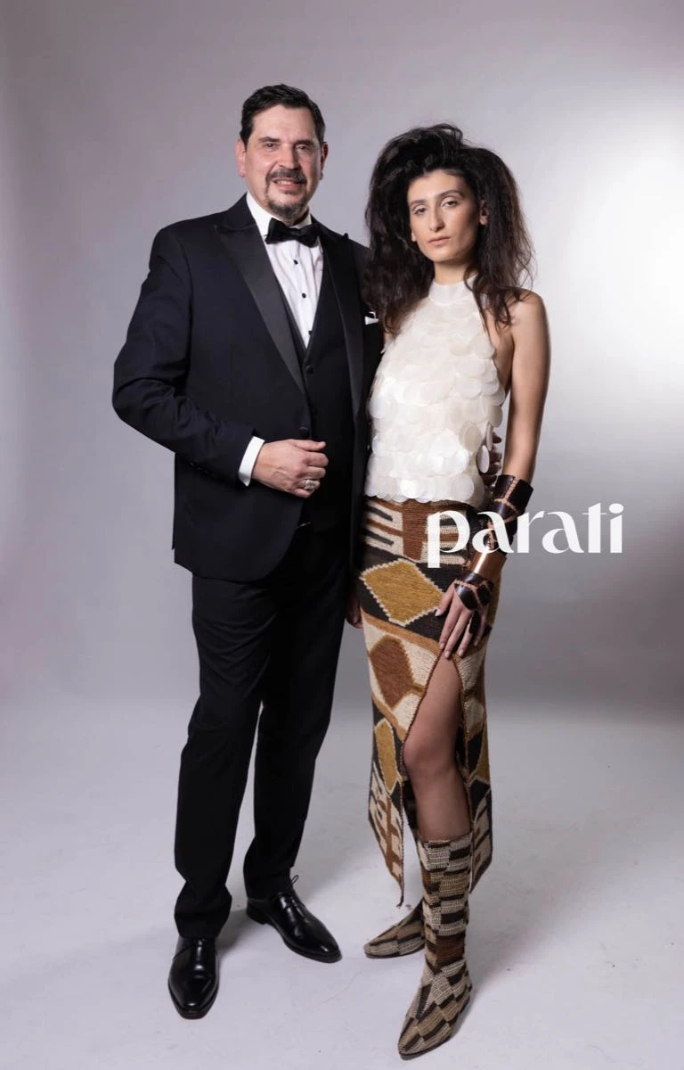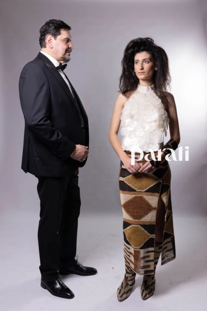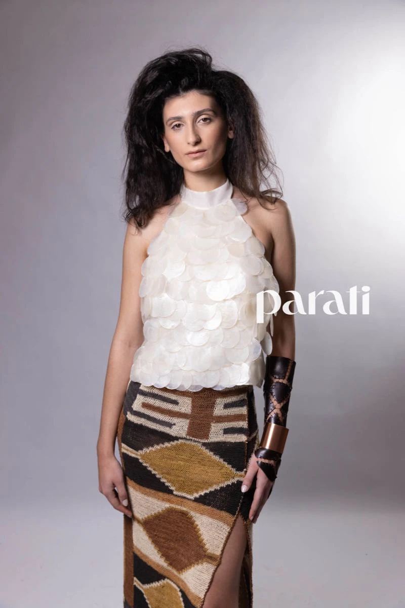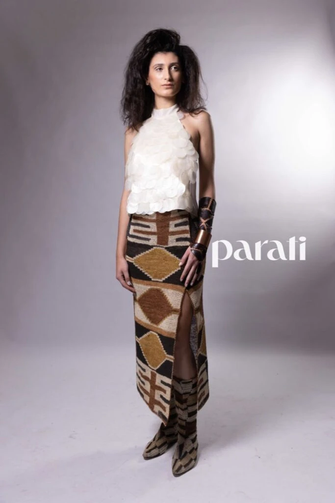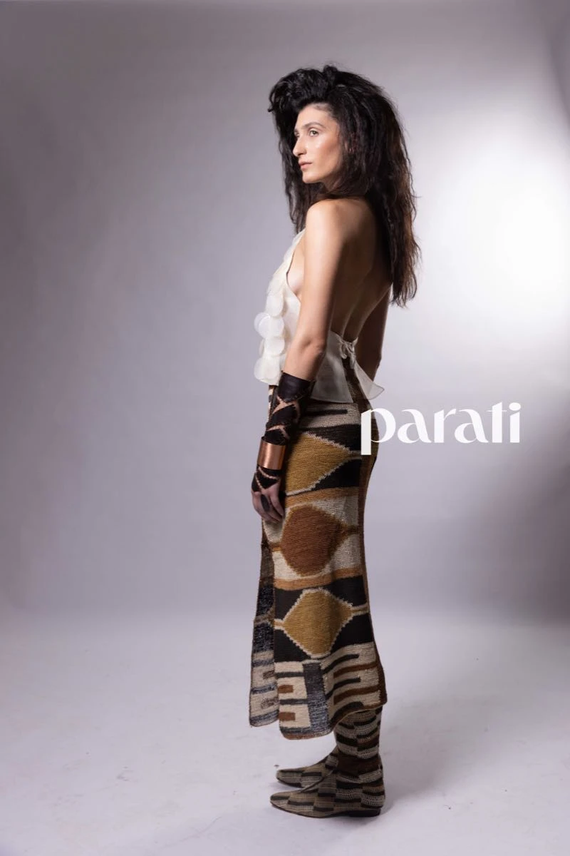 La prenda inferior es una pollera tipo pareo cruzada, confeccionada en chaguar —fibra vegetal autóctona— con dibujos geométricos que evocan raíces ancestrales. El look se completa con botas chatas de chaguar, brazaletes de cobre y un cuenta ganado del mismo material, que refuerzan la estética artesanal y sofisticada.