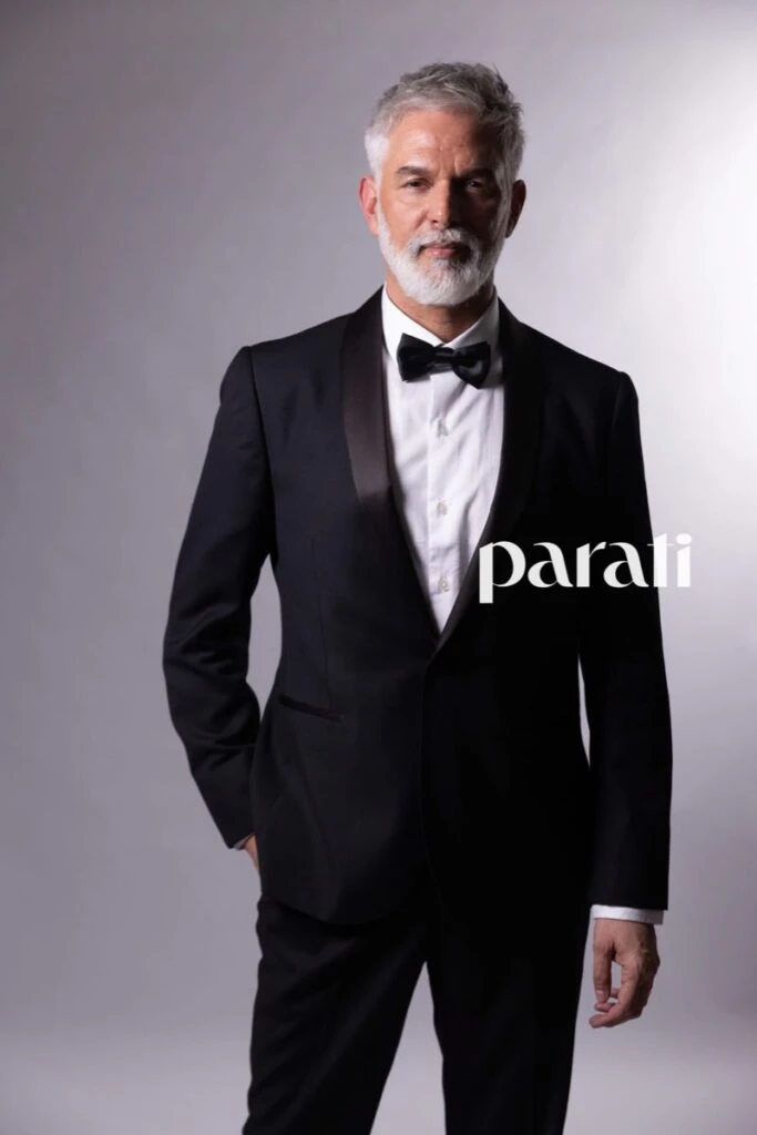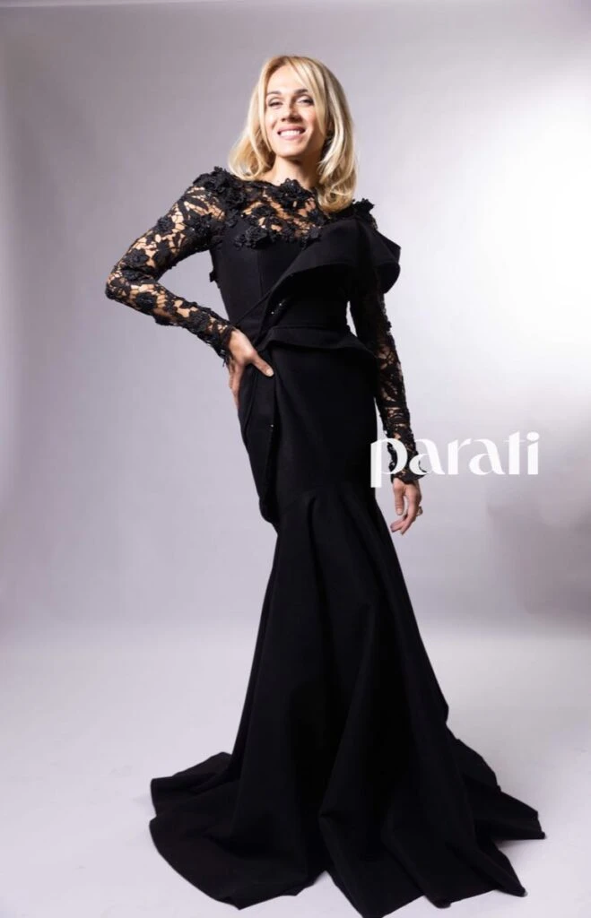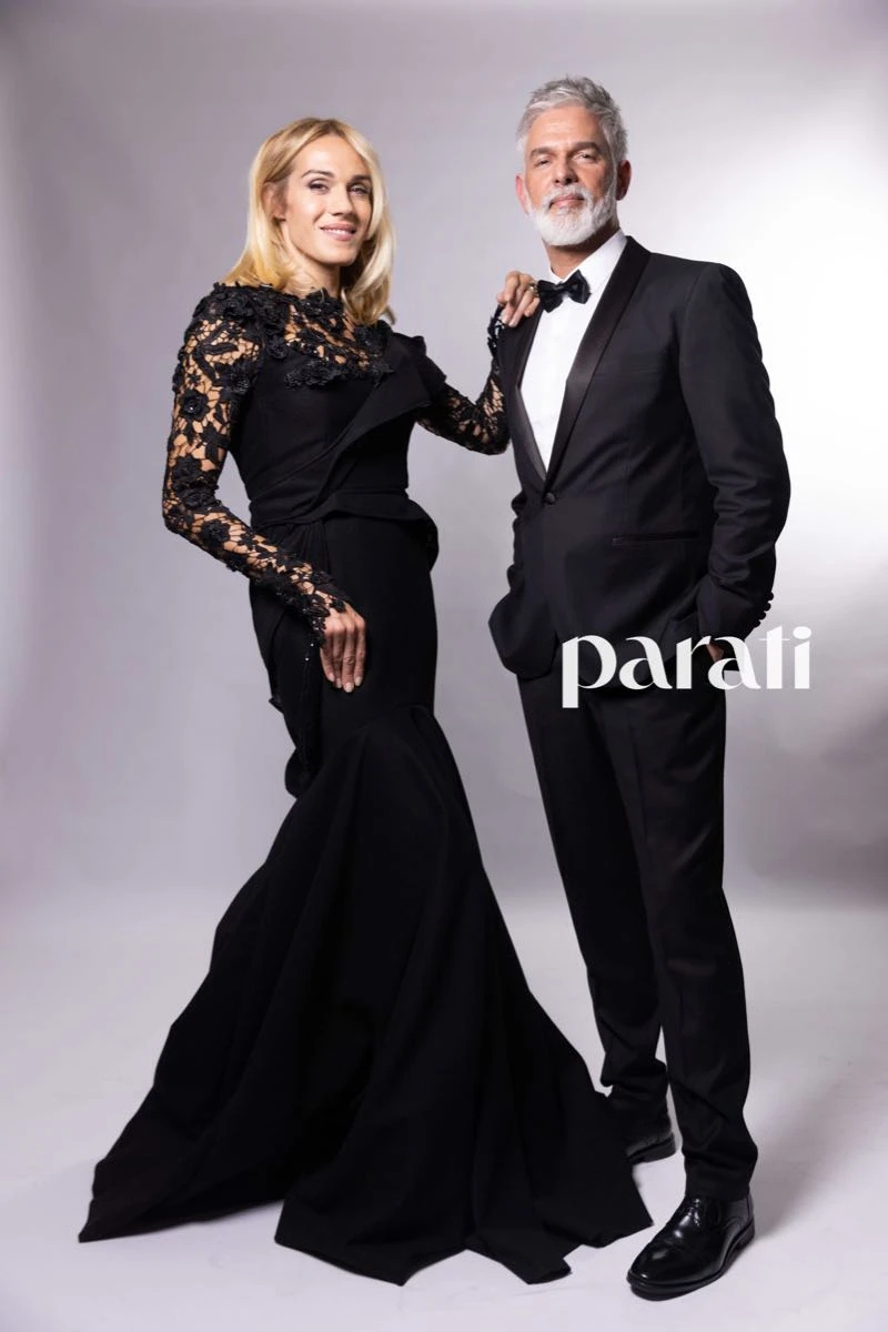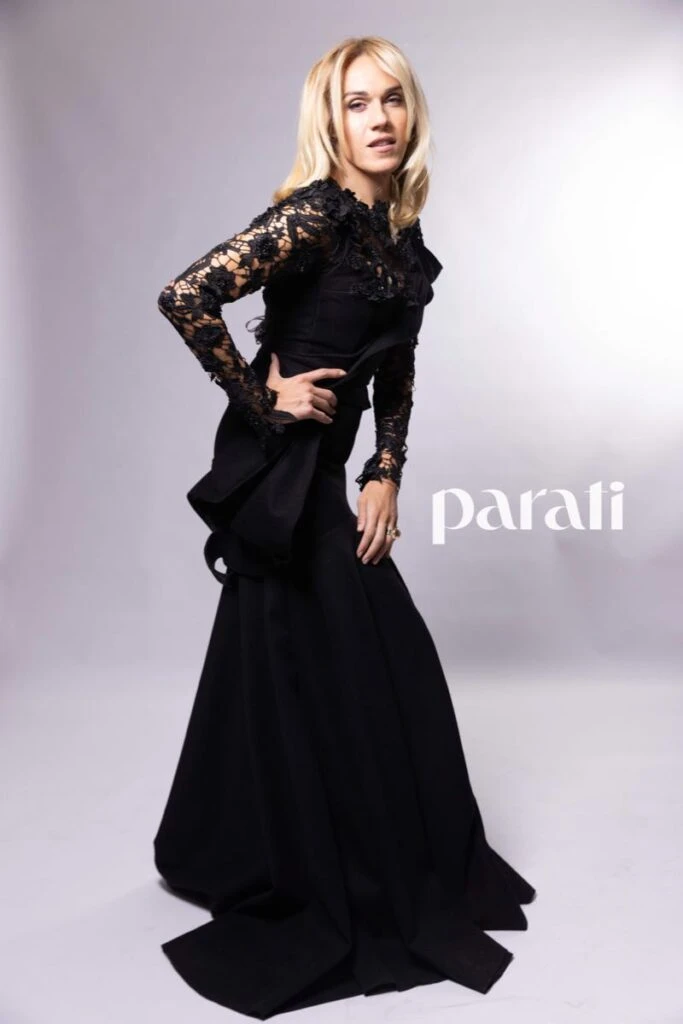 Para esta gala, Maximiliano Jitric creó un vestido con morfología de reloj de arena, pensado para enmarcar y estilizar el cuerpo de Mariana Genesio Peña. La pieza combina paño y guipiur, dos materiales de texturas contrastantes, y está realzada por detalles bordados que aportan sofisticación y movimiento.