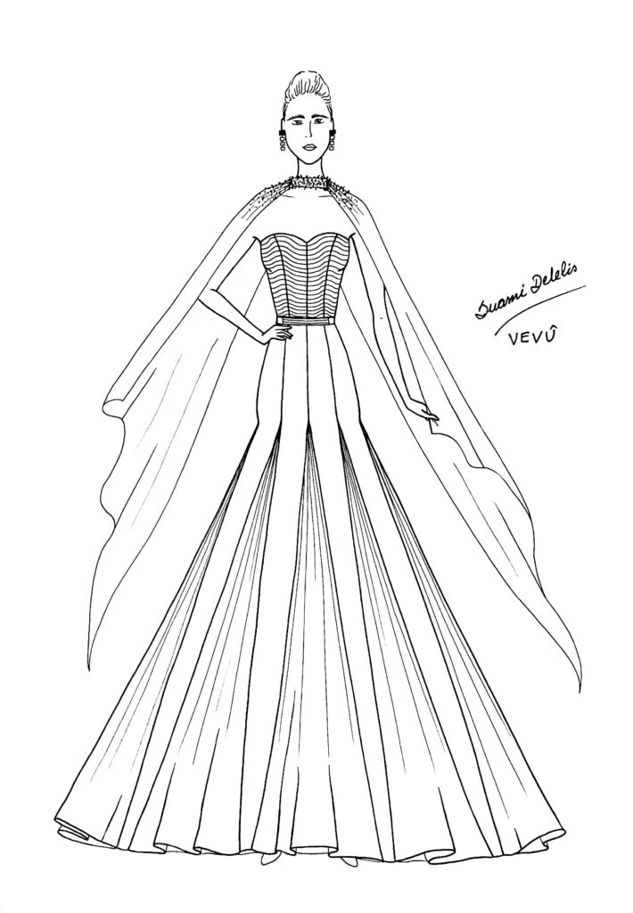 El diseño incluía un bustier bondeado, sostenido con pespuntes que realzaban el volumen, y una falda con cortes tipo estacas adornada con quillas volantes aplicadas en contraste de texturas. Como toque final, sumó un veil neck vaporoso en el escote, bordado a mano y apoyado en los hombros, realizado en el mismo textil, en contraposición con la textura del vestido.