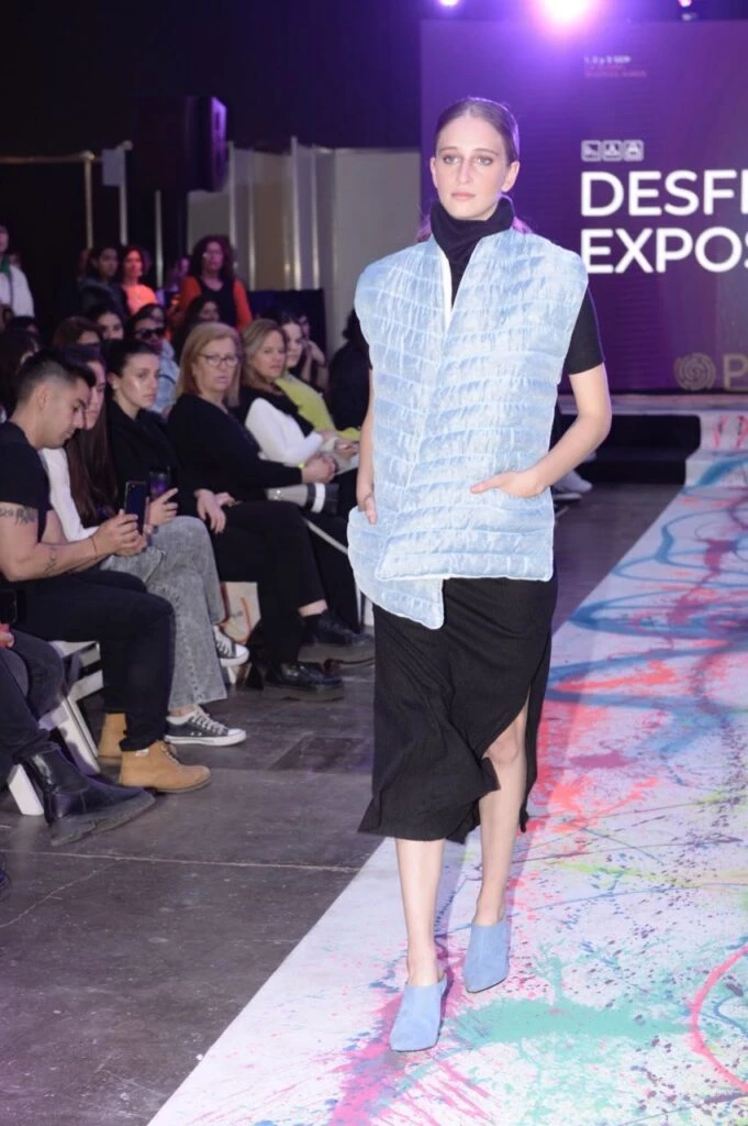 Estepa presentó en pasarela un chaleco upcycling realizado a partir de cortinas de baño desechadas y está relleno con estopas de jean reciclado de la Cooperativa Miremos para adentro.