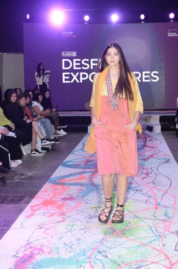 Alkimia presentó un diseño inspirado en la Festividad del Sol Andino utilizando algodón de producción local y cooperativa teñida a mano con tintes naturales.