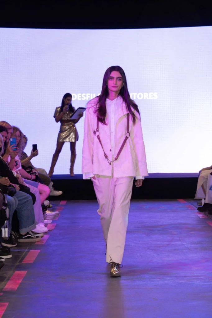 Se mostró un conjunto de remera y el pantalón de lino. Este autor se presenta bajo el programa "chacu" con su propuesta de indumentaria en jeans y lienzo, materia prima autóctona de la provincia de Chaco.