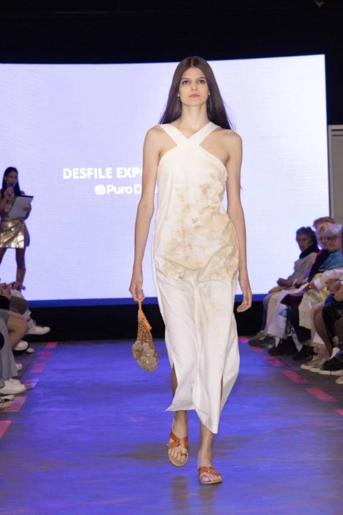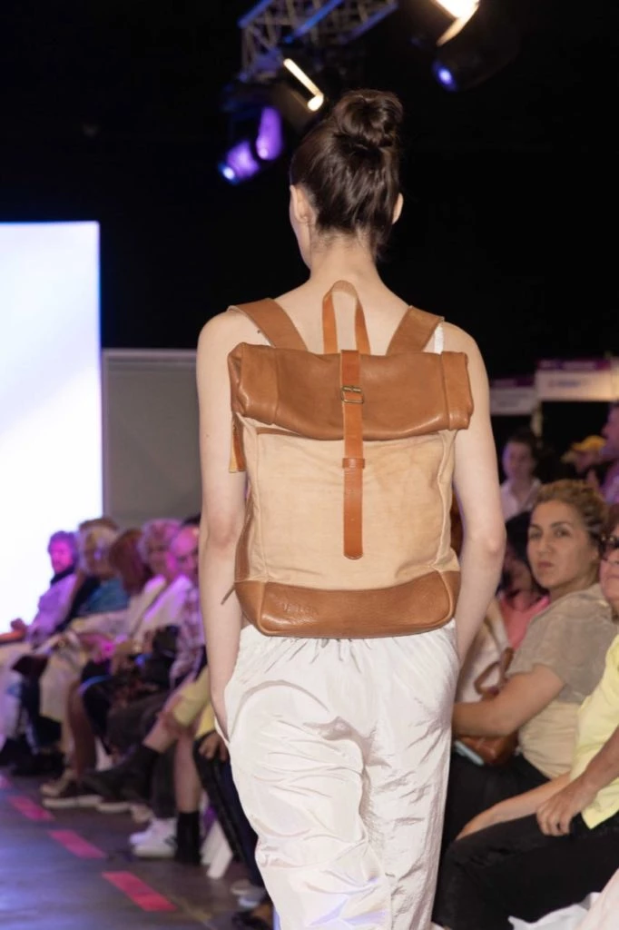 Se mostró un bolso confeccionado en nido algodon 100% y ecocuero biodegradable cuya forreria interna es de lienzo de algodón 100%. La correa es regulable.