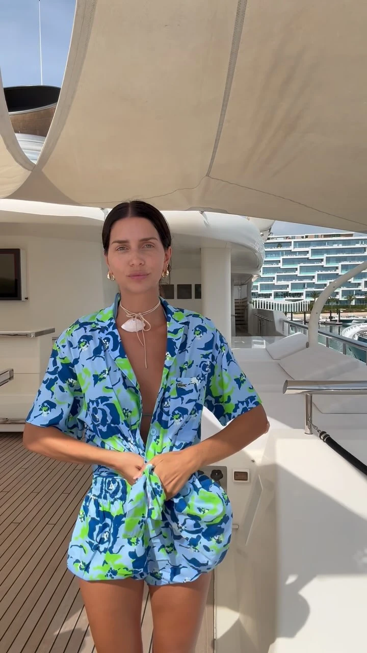 Se trata de una camisa de una reconocida marca en estampado en colores azul, celeste y verde flúor. En el caso de la pareja de Facundo Pieres, esta la combinó con un short de la misma firma, que llevó sobre una bikini en azul lavanda.