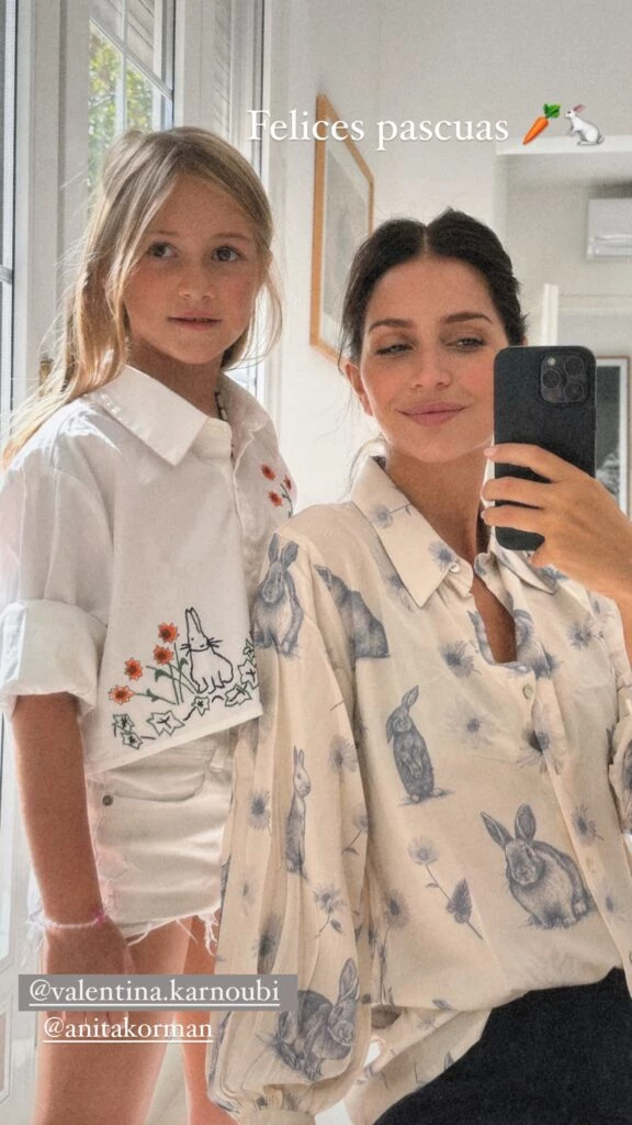 Por otro lado, su hija llevó otra camisa con mangas largas, pero arremangada, con dibujos de conejos y un short de jean. Ambas lucieron combinadas y con un divertido guiño a este domingo en cuestión.