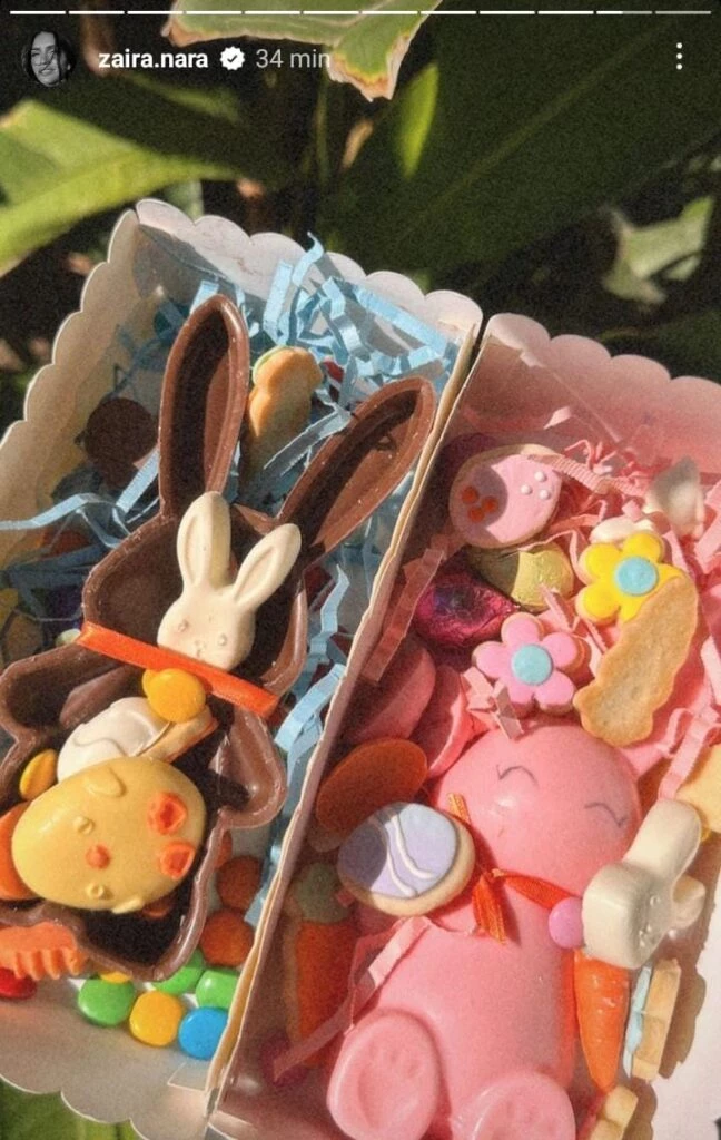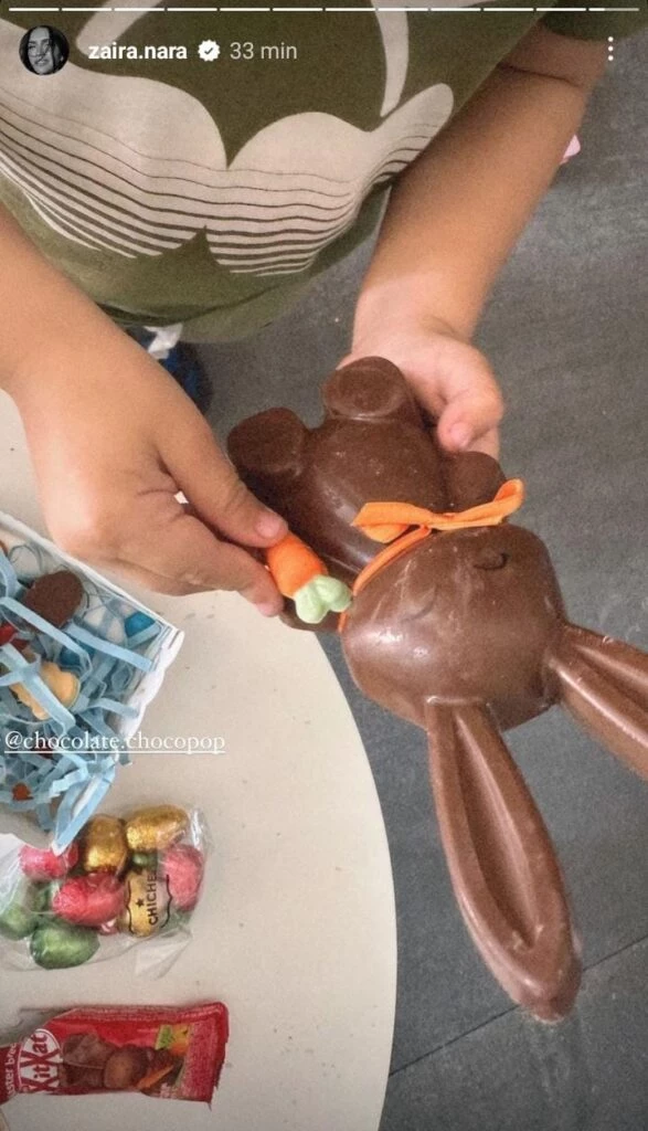 "Felices Pascuas", escribió Zaira, que reveló que su hijo Viggo no quiso seguir esta combinación de looks, ya que usó una remera verde militar y unas bermudas. Horas después, la modelo compartió a los niños disfrutando de conejos y huevos de chocolate, tras su llegada a casa.