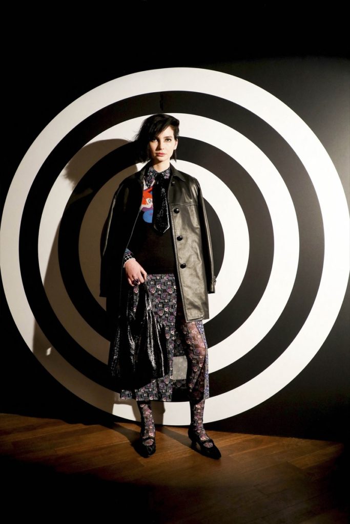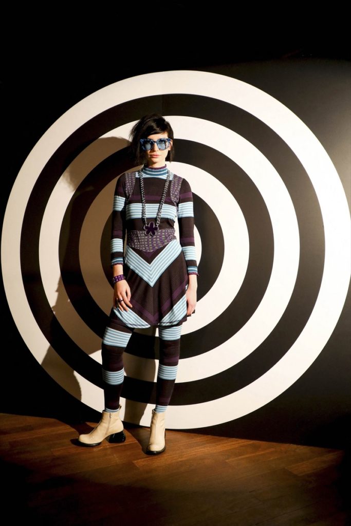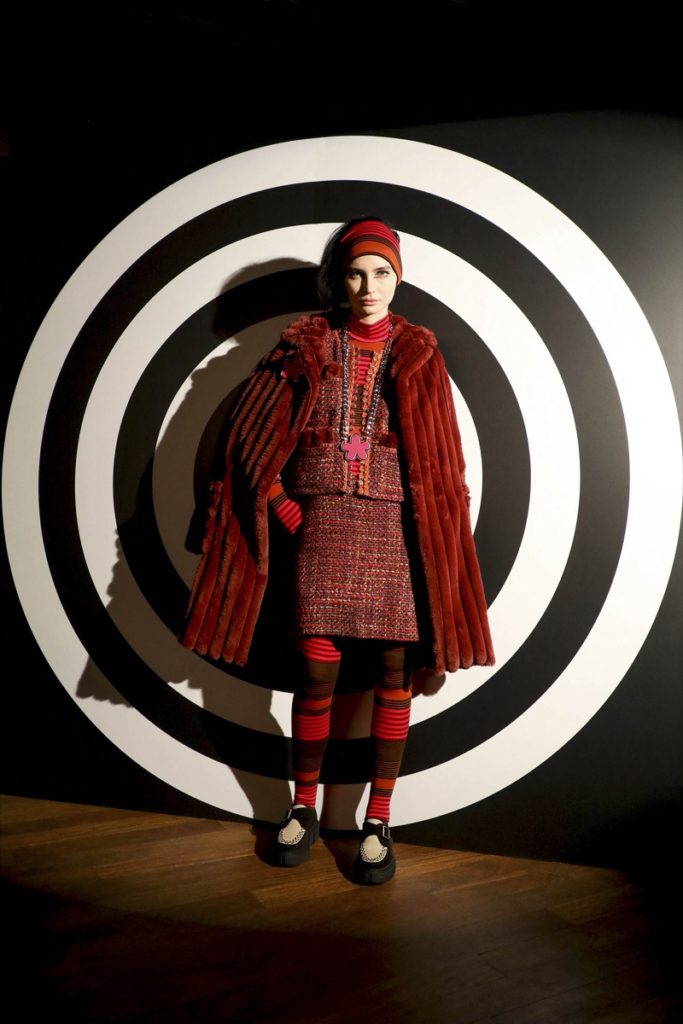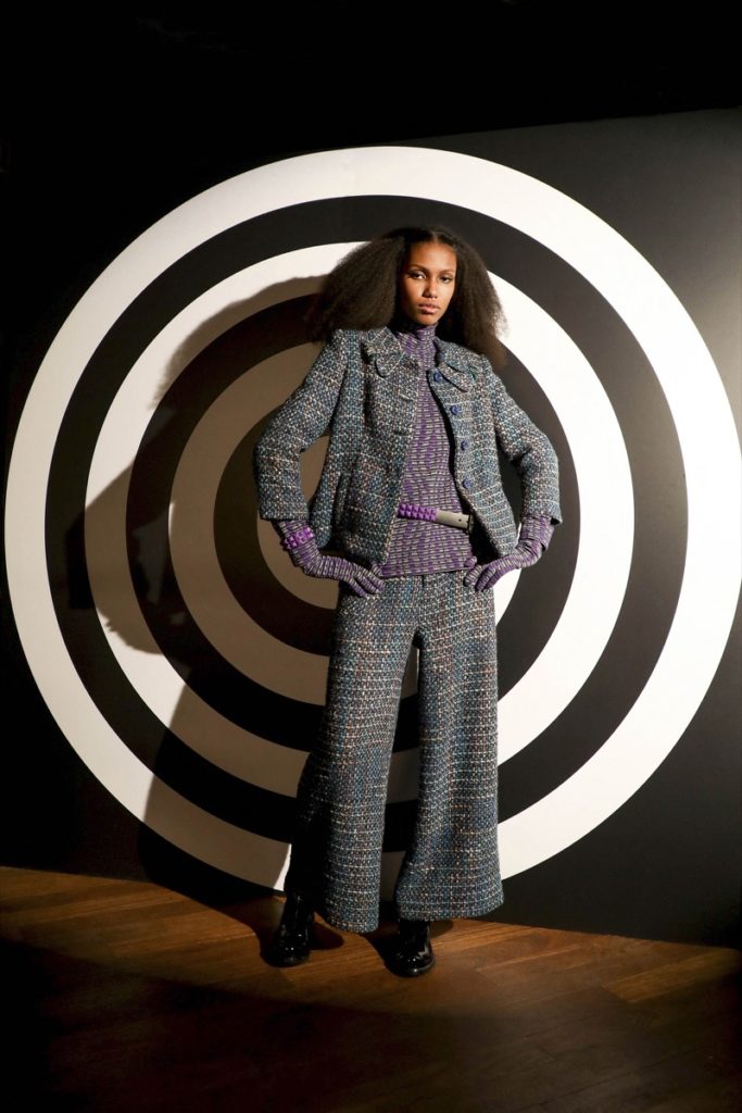 Se destacaron los trajes de tweed, las chaquetas tejidas bien cortas con ribetes en lila y los tacos bajos de John Fluevog que son primos de los originales de los años 60 de McGowan, combinados para evocar la forma caleidoscópica en que los jóvenes se visten a sí mismos hoy en día.