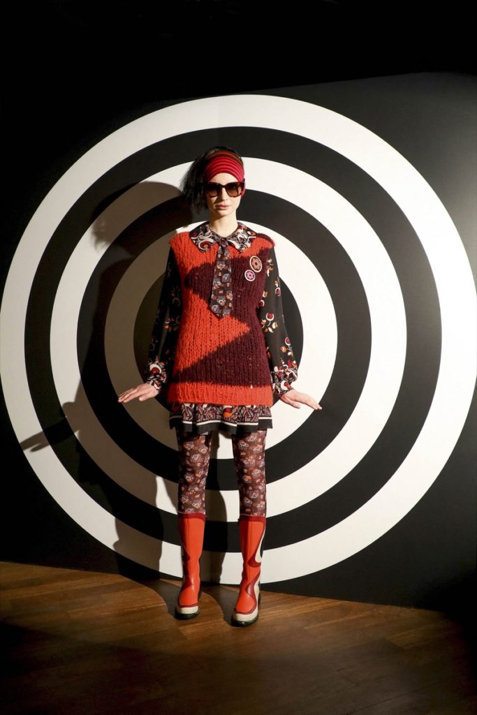 La diseñadora propone llevar los trajes de punto granny square con botas de piel sintética, los abrigos de cuero se combinan con corbatas, los vestidos a rayas de los años 70 se combinan con cinturones bajos con placa de identificación como los que solías comprar en Saint Mark's Place en principios de los 90.
