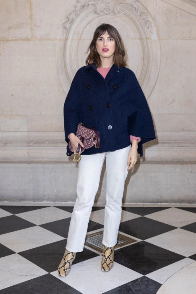 Jeanne Damas eligió un look al minimalismo que elevó con accesorios muy llamativos. La fundadora de Rouje eligió un abrigo de capa navy, pantalones blancos de corte recto, unas botas con taco de piel de serpiente y un bolso Saddle con el estampado de logo Dior Oblique en color rojo.