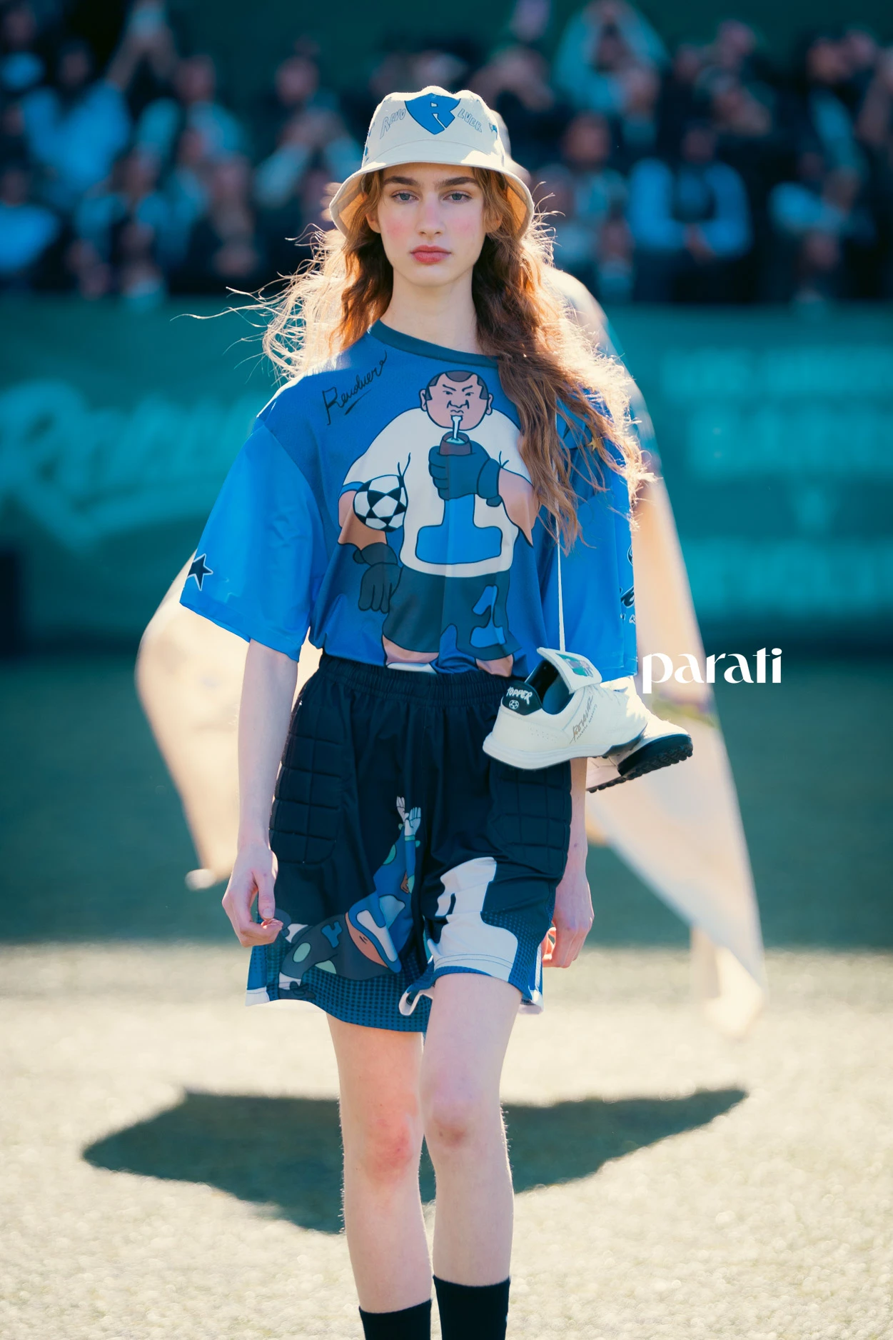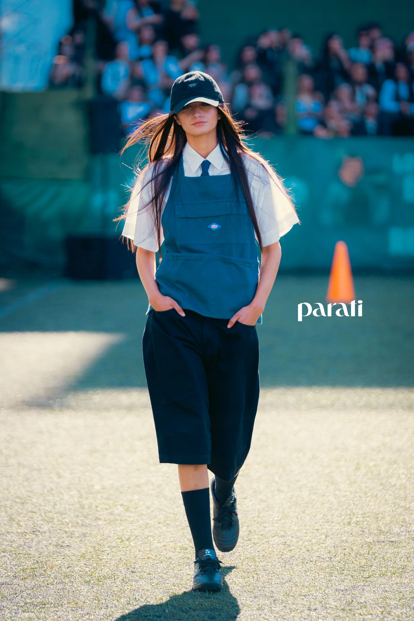 La puesta fue toda una performance: jugadores de fútbol, árbitro, hinchada local con bombos y tinglados, y los modelos desfilando en el campo de juego. Una propuesta que unió moda, deporte y cultura popular en un mismo espacio.