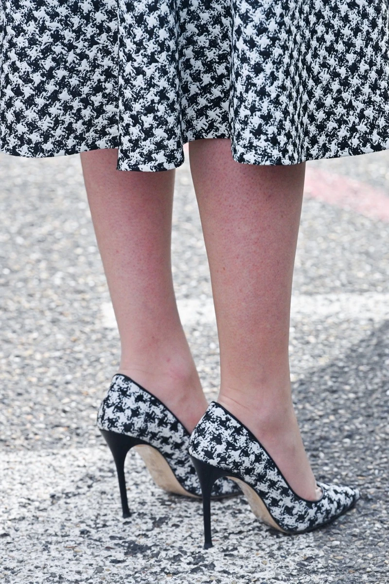 Para esta ocasión llevó un vestido con estampa pied de poule en blanco y negro, con largo midi y cintura bien marcada. Sobre los hombros agregó un saco de mohair en color negro.