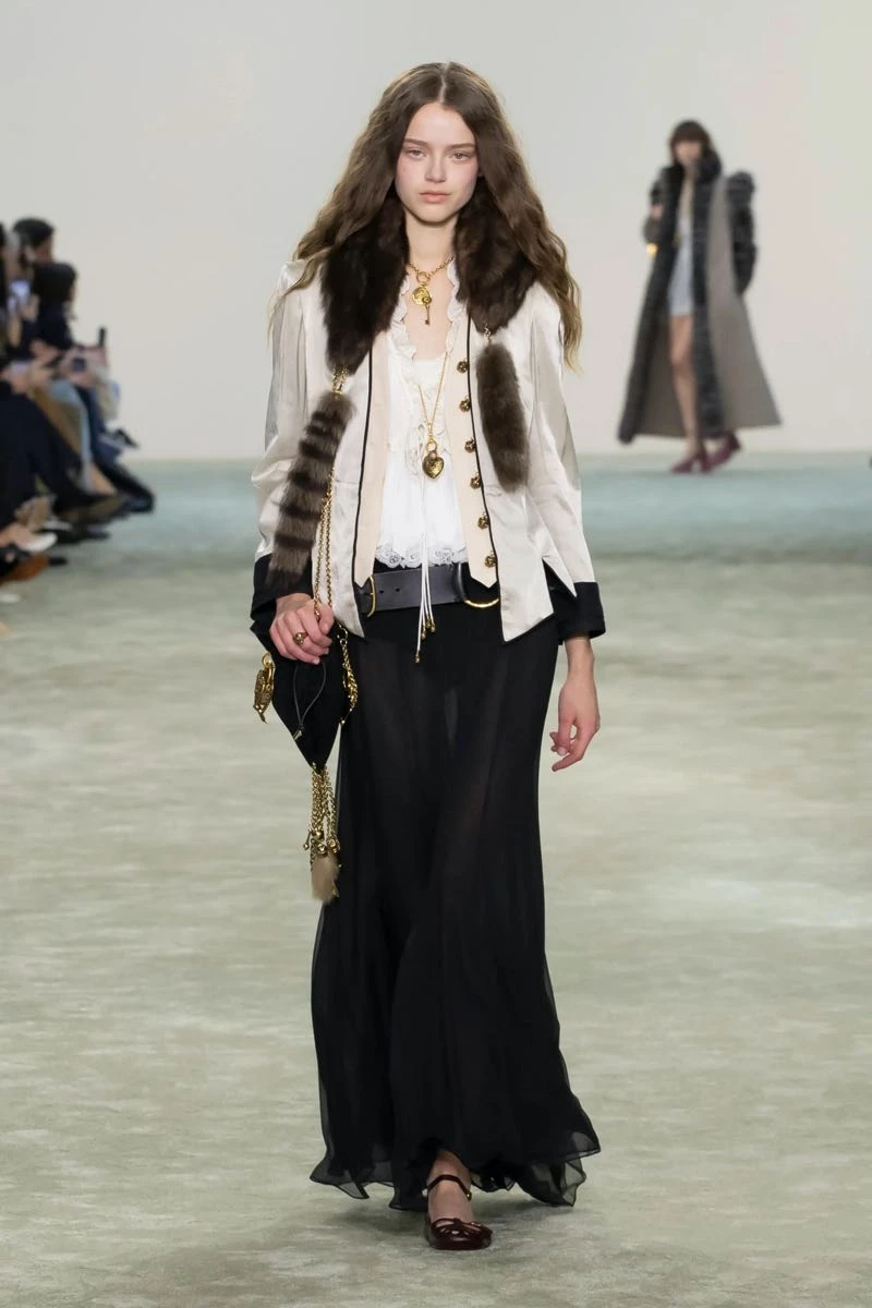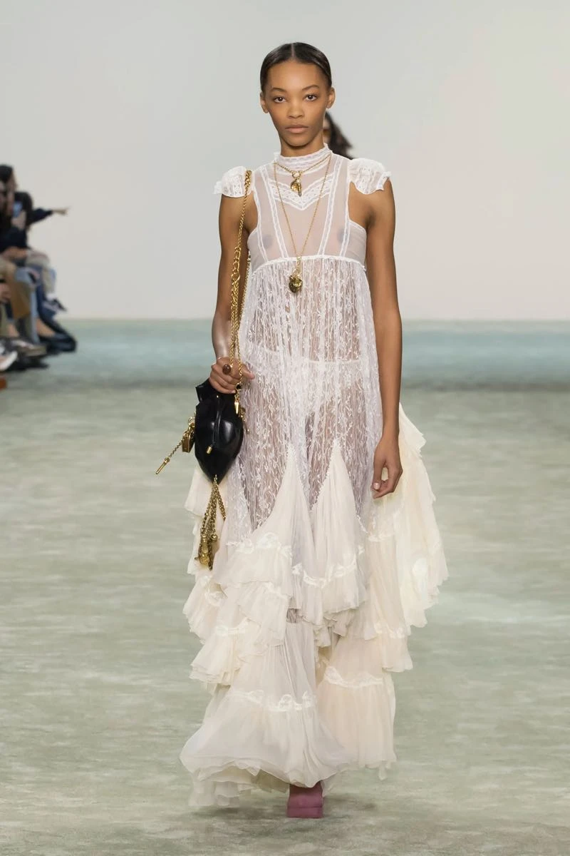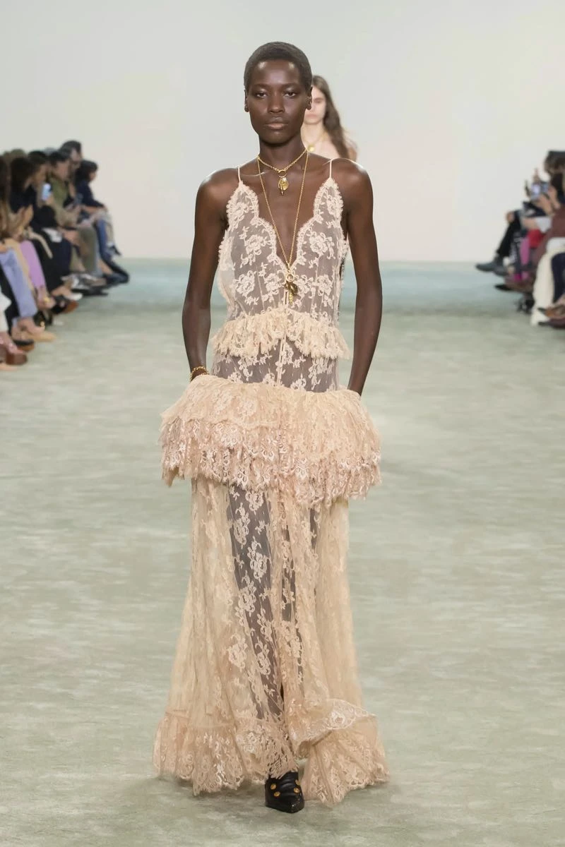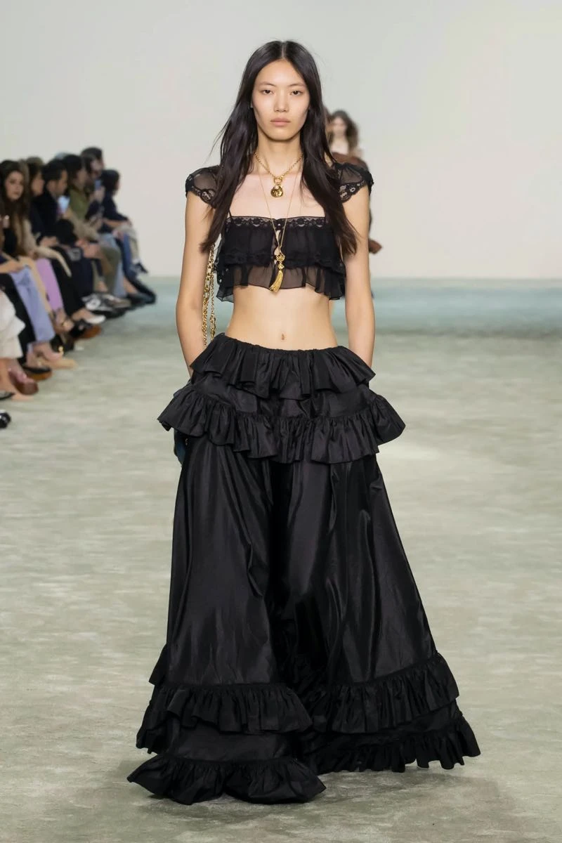 En su desfile, Chloé presentó una silueta que pone el foco en una feminidad libre y en movimiento que se expresa a través de texturas fluidas y materiales envolventes.