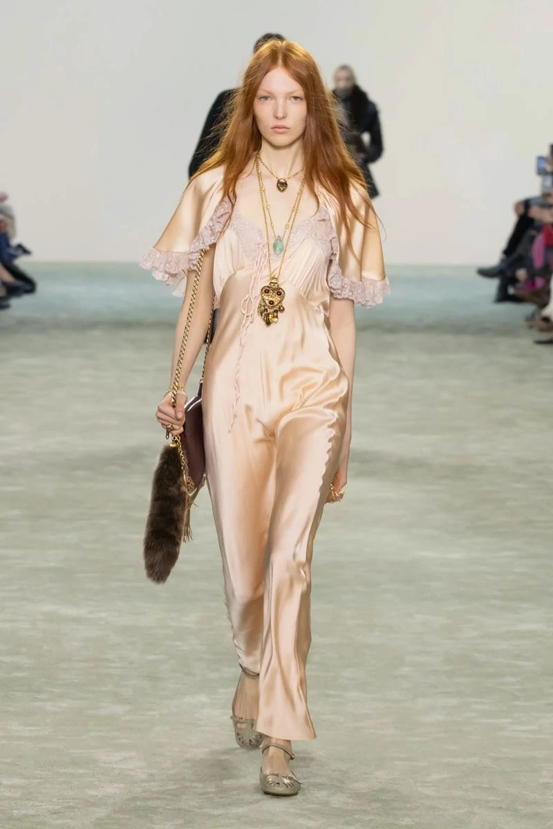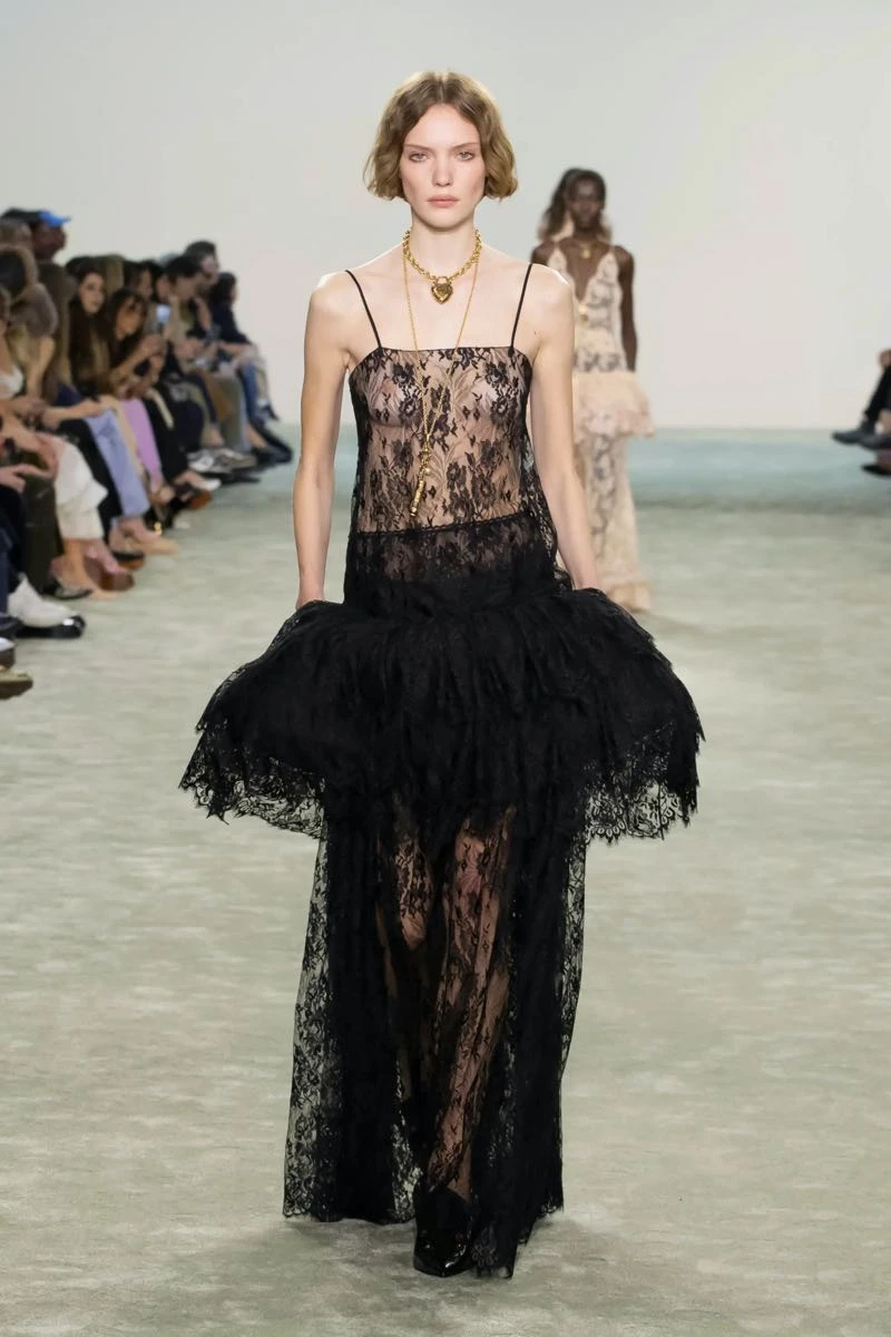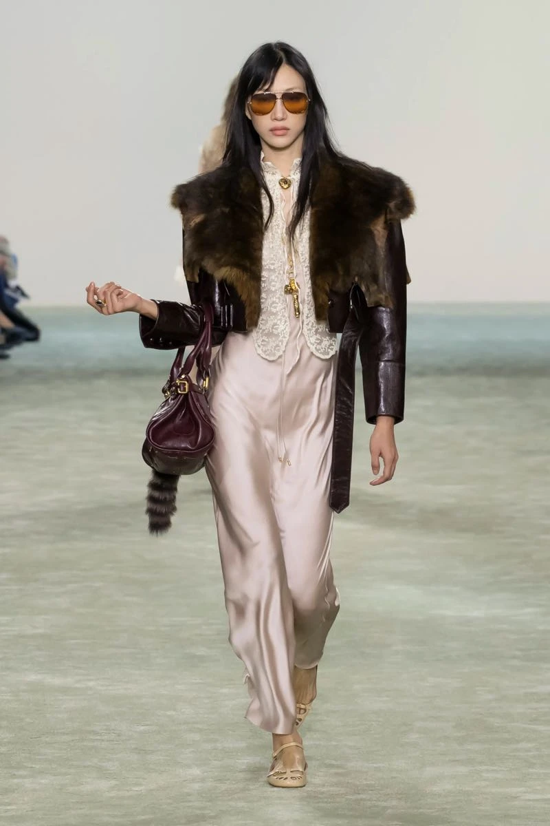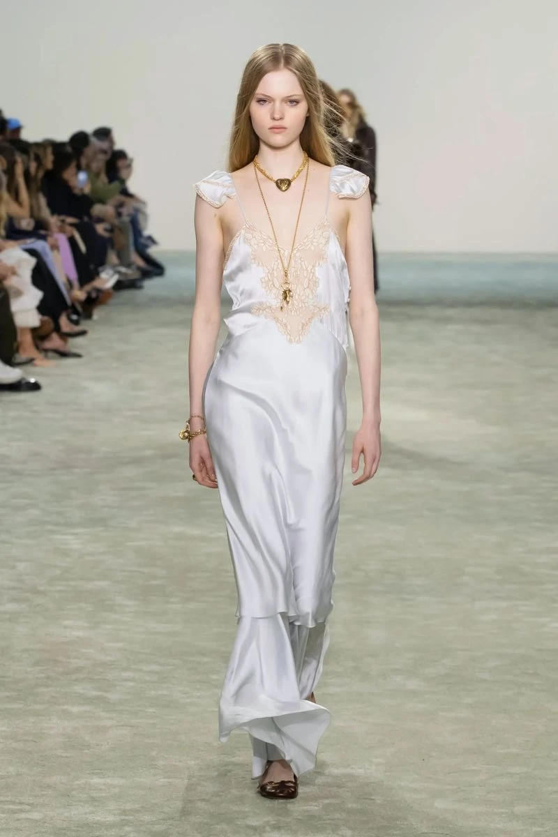 En su desfile, Chloé presentó una silueta que pone el foco en una feminidad libre y en movimiento que se expresa a través de texturas fluidas y materiales envolventes.