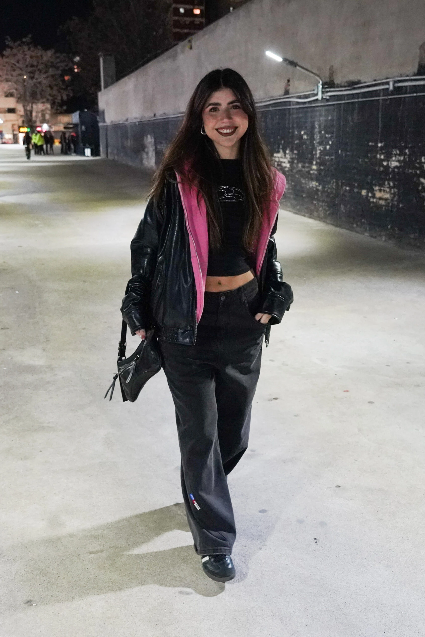 Llevó un jean negro de tiro bajo, modelo mom, que combinó con una remera negra básica y una campera bomber al tono. Debajo, Cami llevó un abrigo de friza rosa, que aportó un toque lúdico y colorido a su look.