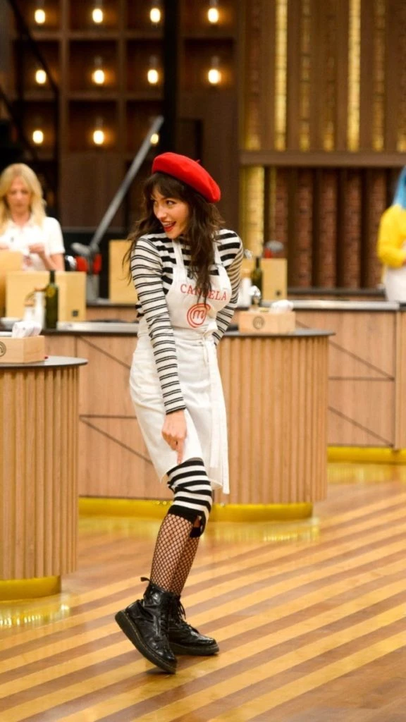 Como complemento sumó unas medias de red, unos borcegos y su toqye de distinción lo aportó la boina roja que pasó a ser la protagonista de su outfit.
