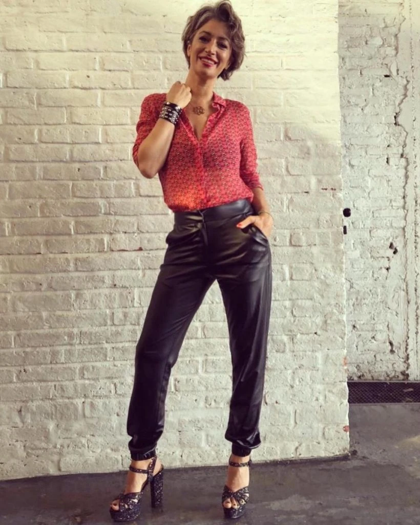 Carla apuesta a las camisas de color, rojo y turquesa son sus favoritas, y las combina con prendas de cuero ecológico, ya sean pantalones o pollera recta.