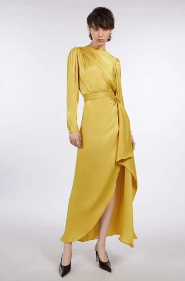 Pereyra apostó por un vestido midi, de la firma Costarellos, confeccionado con lurex georgette, en un tono amarillo cúrcuma que otorga brillo y luminosidad. Esta delicada pieza posee frunces en la zona de los hombros y tiene un corte en el busto, logrando un efecto de sensualidad, sin mostrar de más.