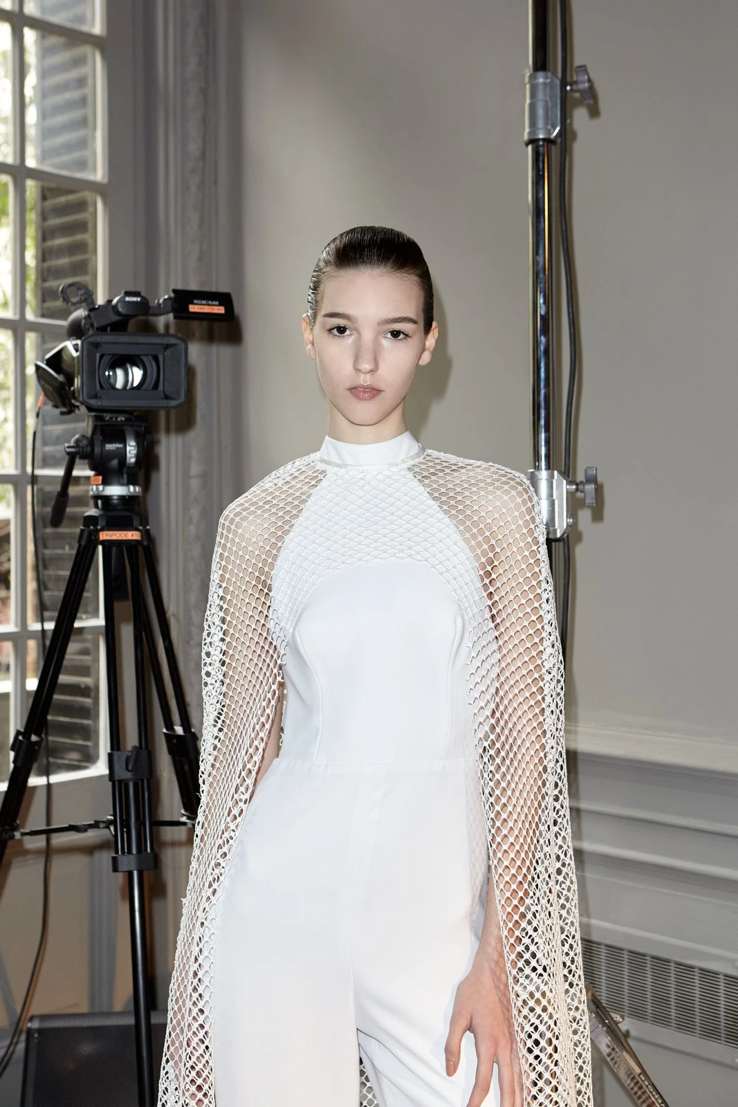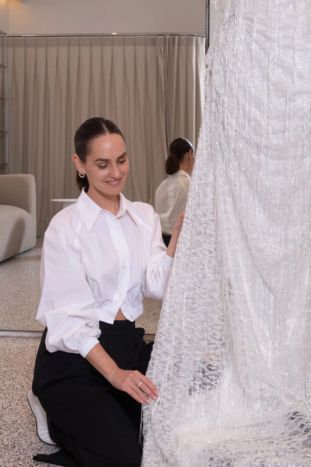 “Una capa puede transformar completamente un vestido. Me encanta proponer prendas que acompañen la ceremonia y después se puedan quitar en la fiesta”, explica.