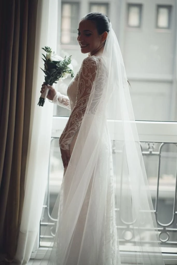 Los detalles marcan la diferencia, y Camila los piensa para cada mujer según su estilo, su cuerpo y su edad. Entre sus propuestas más habituales para novias invernales aparecen los cuellos cerrados, las mangas largas de encaje, las ruanas y —por supuesto— las capas: