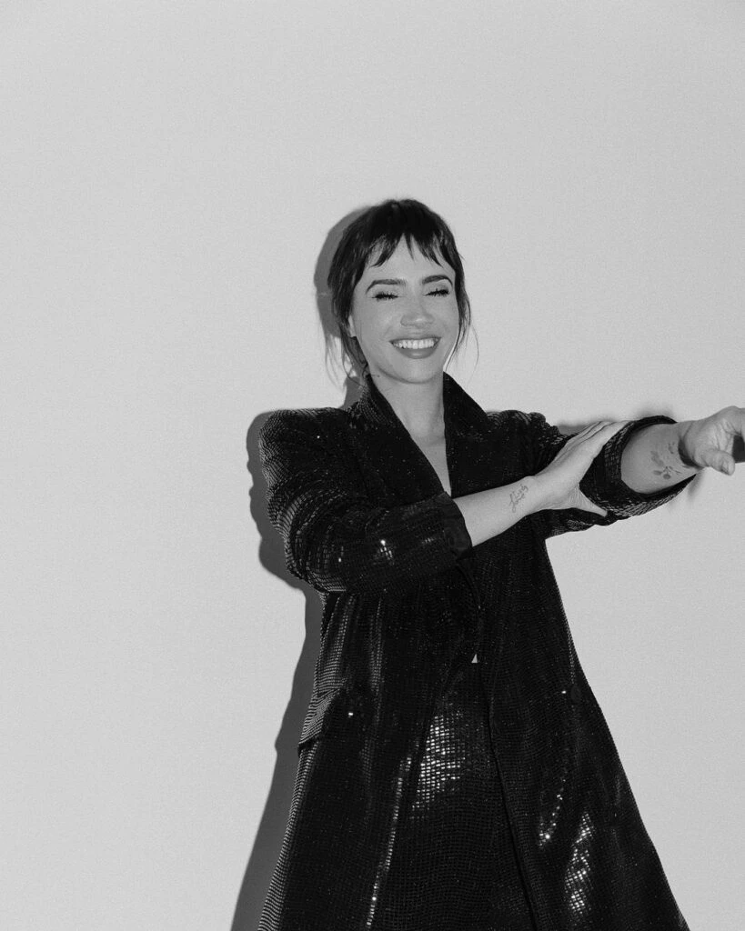 Además, incluyó un blazer largo de silueta recta, también confeccionado con lentejuelas y de cómodo calce. Toda la prenda en color negro y con broches pulpo en zona delantera. Se trata de un outfit donde lo que se prioriza es el brillo, uno de los tips más fuertes de esta temporada 2023.