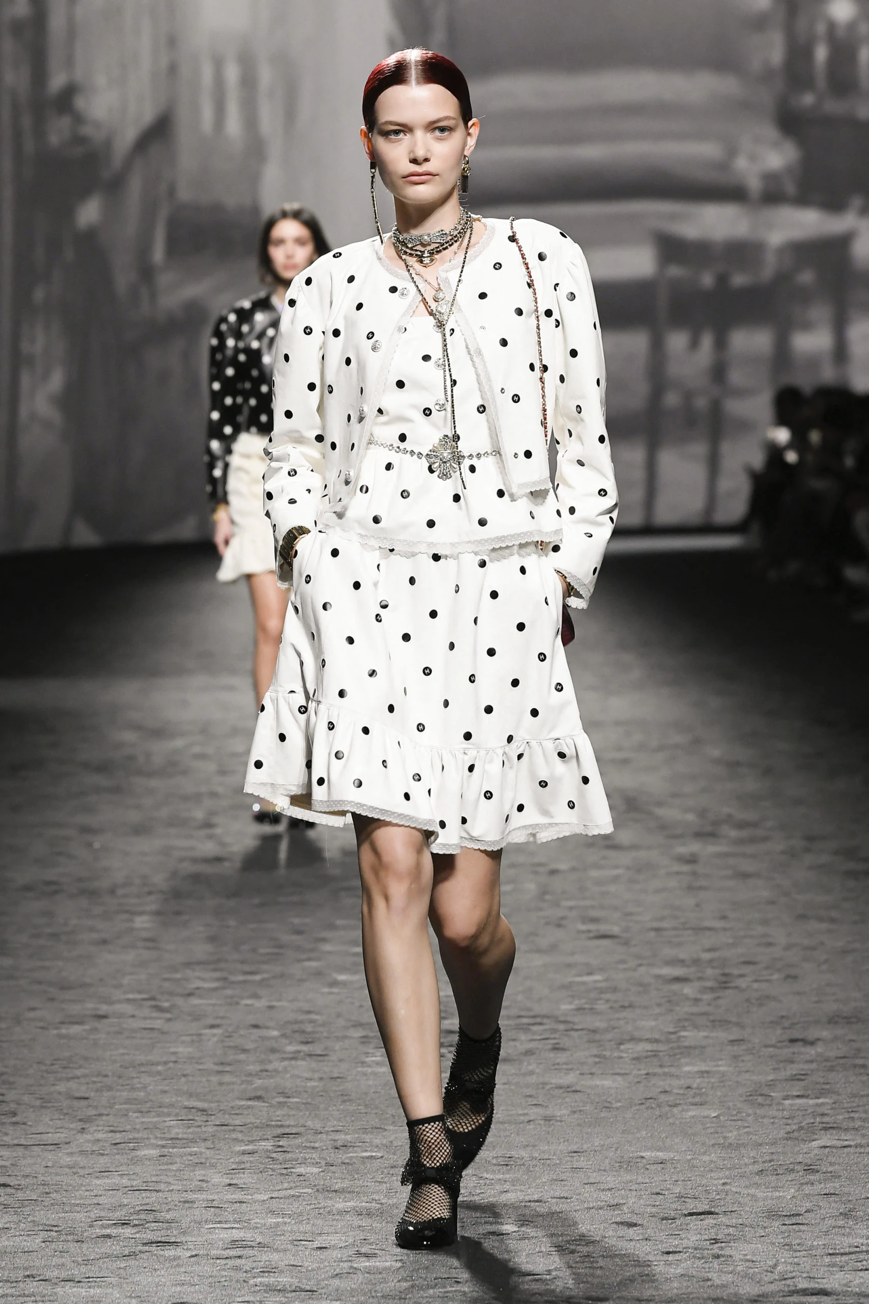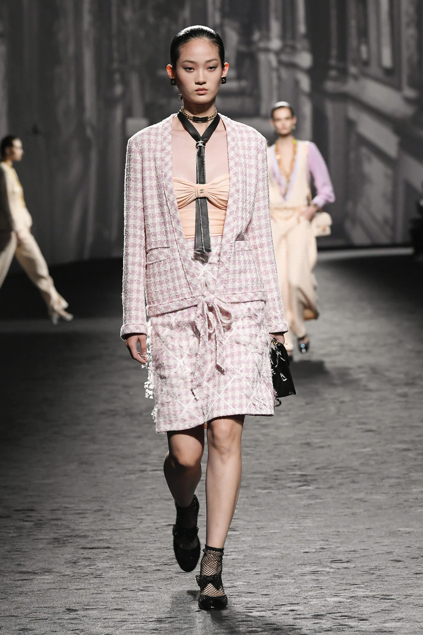 Lazos, boas, botas de pedrería, chaquetas con lentejuelas, tweeds son parte de esta colección ideada por Virginie Viard. La colección está inspirada en la película El último año en Marienbad (1961) de Alain Resnais.
