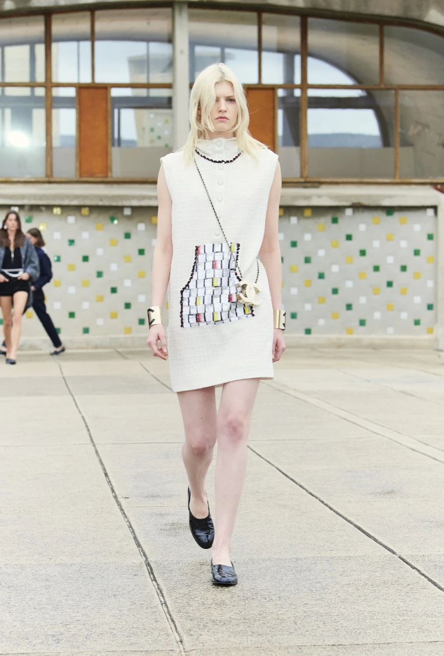 Mientras tanto, de vuelta a la superficie, los reflejos plateados del sol, las ondas y ondulaciones de líneas y formas traen recuerdos de los meses de verano pasados junto a la piscina. También aparecen en jerseys de aspecto neopreno, tweeds y chaquetas de lentejuelas, mientras que otros tweeds y jerseys retoman los colores, los motivos de cuadrícula o las formas geométricas de las fachadas de los hábitats circundantes, para vestidos largos, túnicas e incluso bolsillos bordados.